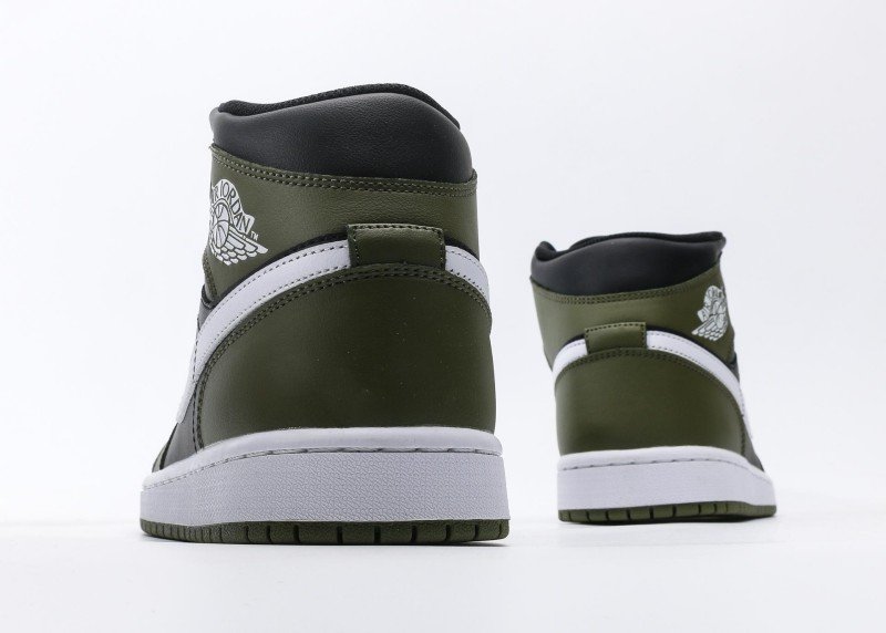 White Swoosh logo on side with smooth lines, creating striking contrast with olive green upper. White AIR JORDAN logo on rear collar with exquisite details, echoing the black collar. Black laces harmonize with black upper, olive green outsole with white midsole for simple color matching, overall design is simple yet layered, highlighting brand craftsmanship.