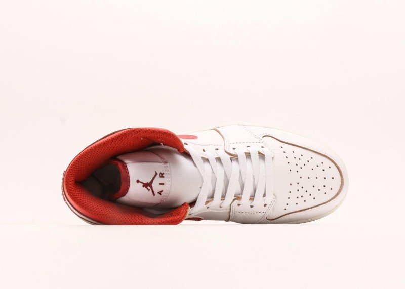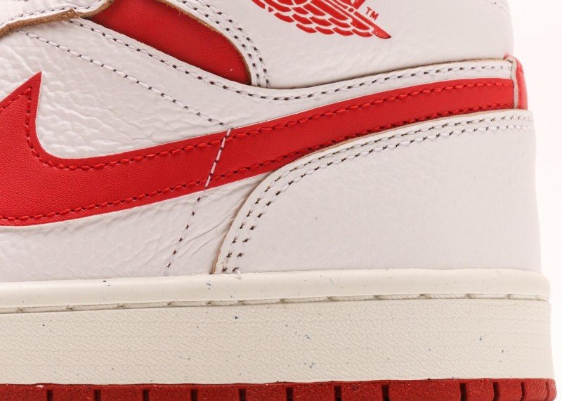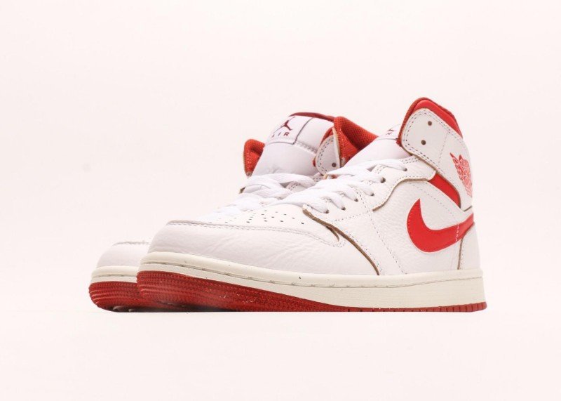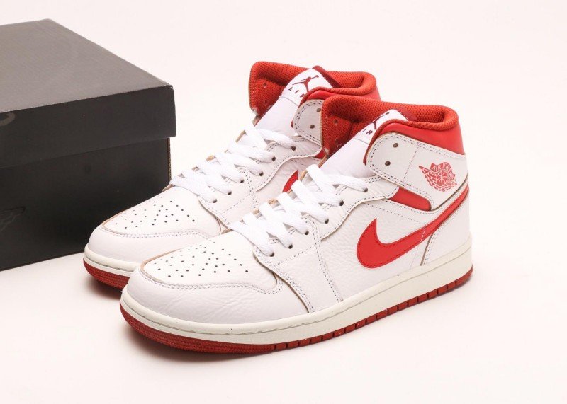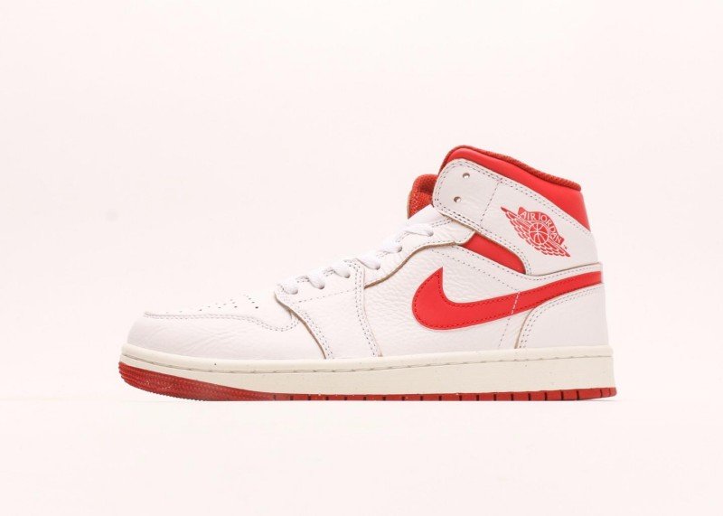 Air Jordan 1 Retro Mid Sneaker features red-white color scheme, reinventing classic fashion style. White leather upper paired with red Swoosh logo and collar, striking color contrast showcases perfect fusion of energy and fashion, suitable for classic-loving trend enthusiasts.