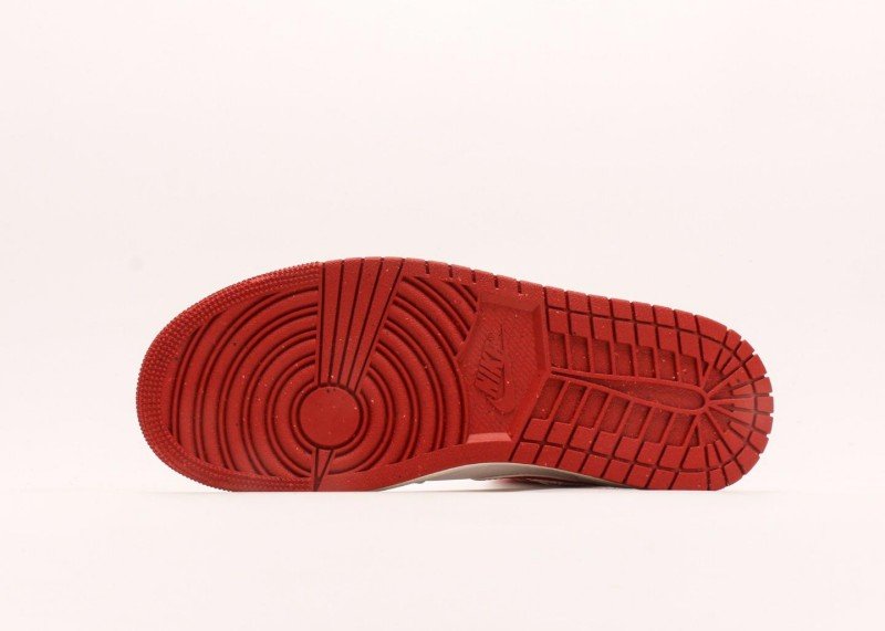 Red Swoosh logo on side with smooth lines, creating strong contrast with white upper. Red Jumpman logo on rear collar with exquisite details, echoing red collar. White laces harmonize with white upper, red outsole with cream midsole for energetic color matching, overall design is simple yet layered, highlighting brand craftsmanship.