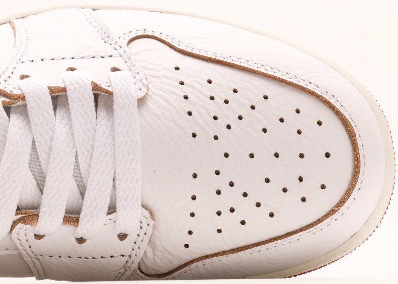 Toe cap and main upper use white leather with smooth texture; red Swoosh logo and collar top use red leather with soft texture; white laces with metallic eyelets enhancing quality; cream midsole with red rubber outsole providing excellent grip.