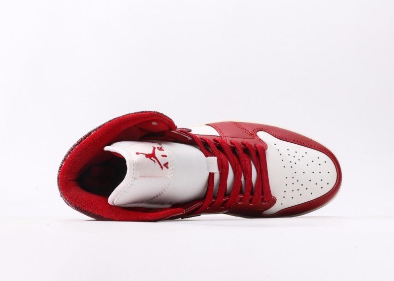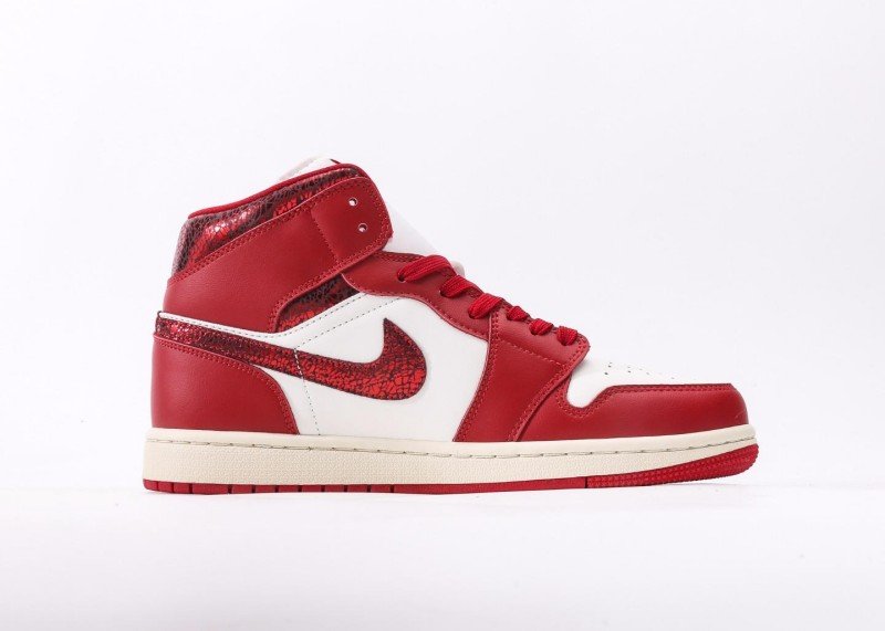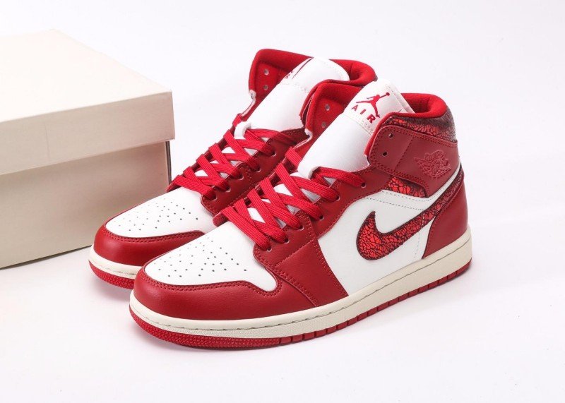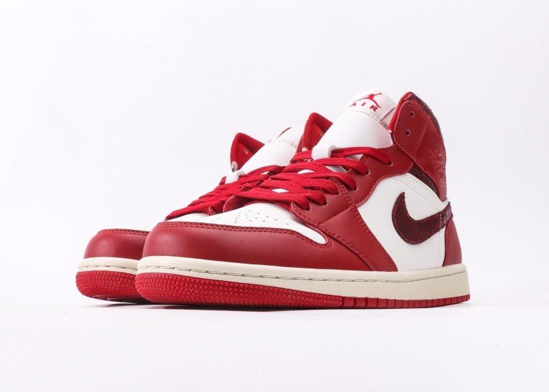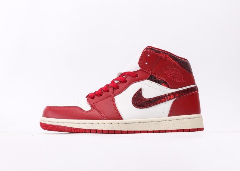 Air Jordan 1 Retro Mid Sneaker features red-white color scheme with snake pattern Swoosh, reinventing retro luxury style. Red leather toe cap paired with white upper, red snake texture adds exotic charm, showcasing perfect fusion of energy and fashion, suitable for personality-conscious trend enthusiasts.