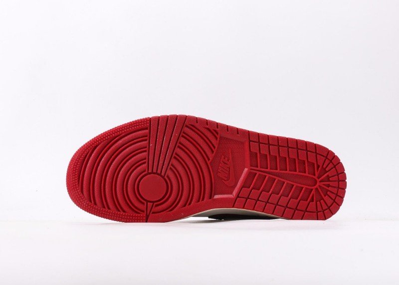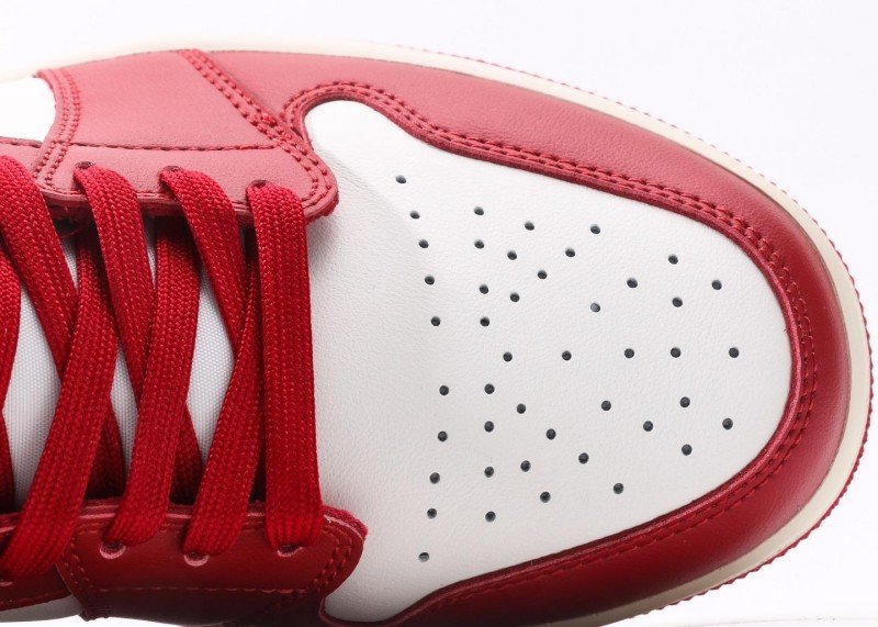Toe cap and side panels use red leather with smooth texture; white leather mid-panel with fine perforations; red snake pattern Swoosh logo and Jumpman logo with shiny finish; red flat laces through white tongue’s red eyelets; cream midsole with red rubber outsole providing excellent grip.