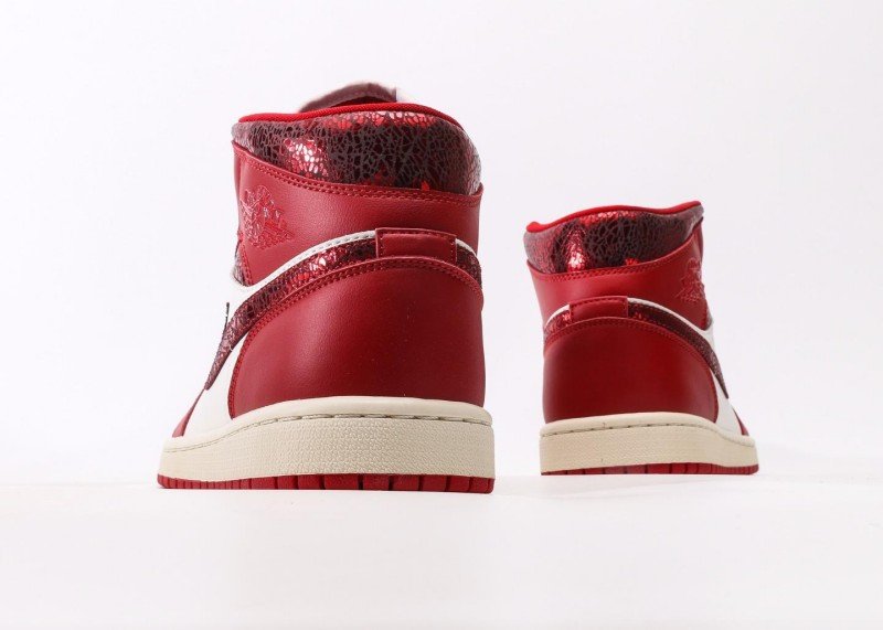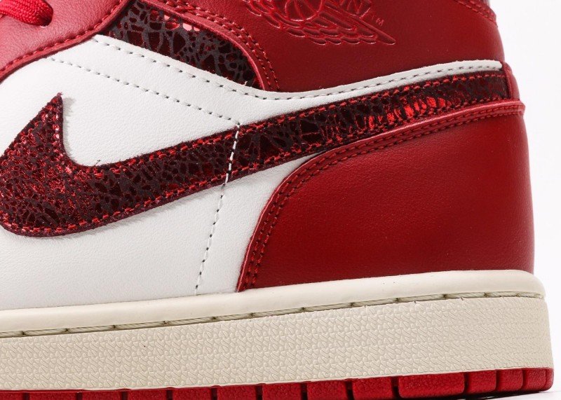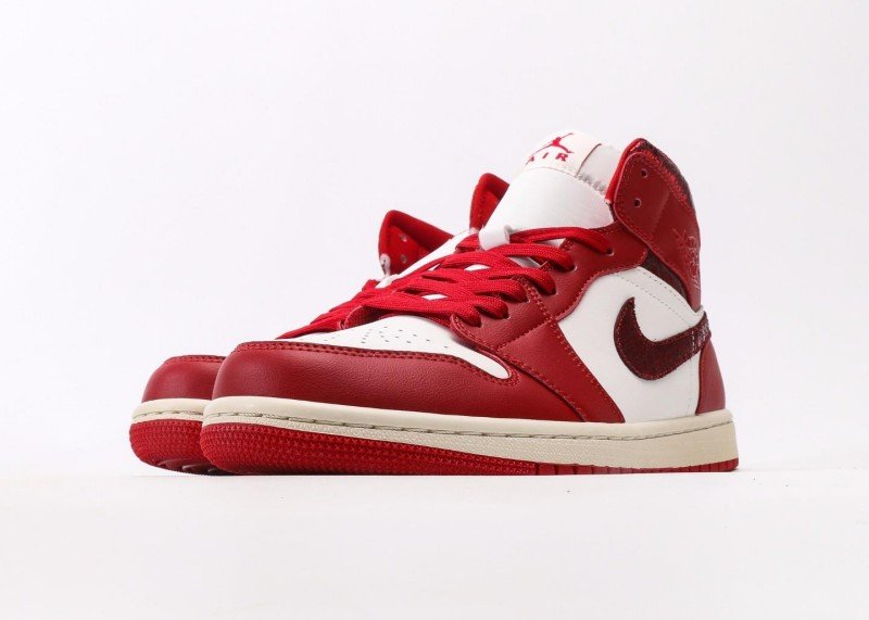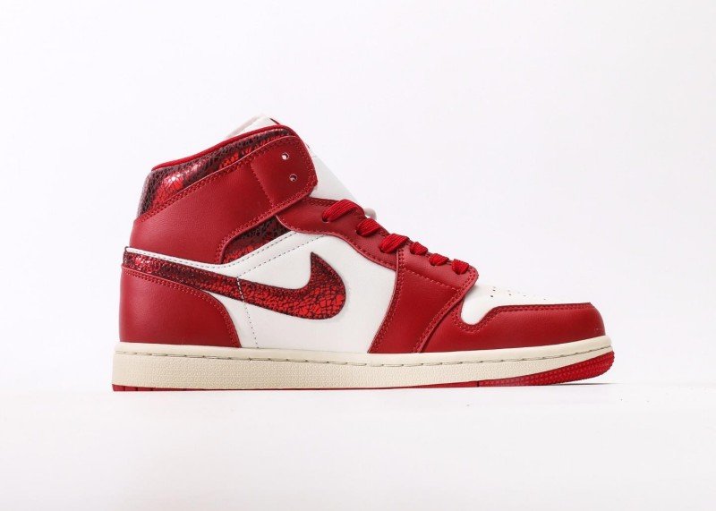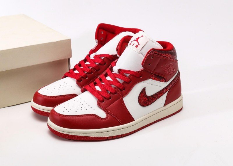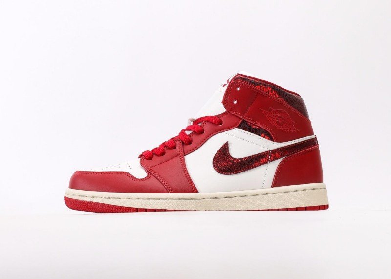 Air Jordan 1 Retro Mid Sneaker features red-white color scheme with snake pattern Swoosh, reinventing retro luxury style. Red leather toe cap paired with white upper, red snake texture adds exotic charm, showcasing perfect fusion of energy and fashion, suitable for personality-conscious trend enthusiasts.