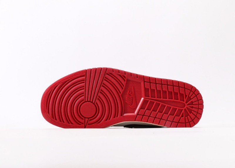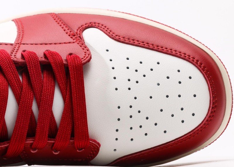 Toe cap and side panels use red leather with smooth texture; white leather mid-panel with fine perforations; red snake pattern Swoosh logo and Jumpman logo with shiny finish; red flat laces through white tongue’s red eyelets; cream midsole with red rubber outsole providing excellent grip.