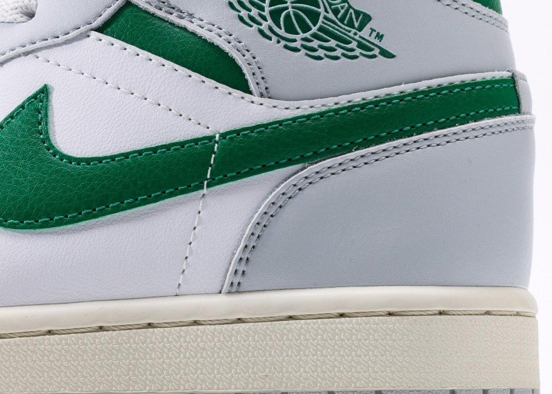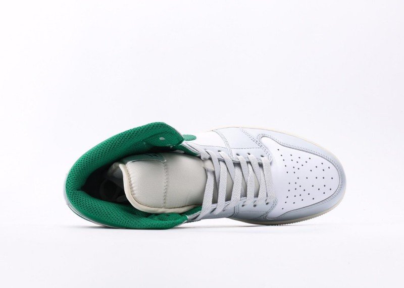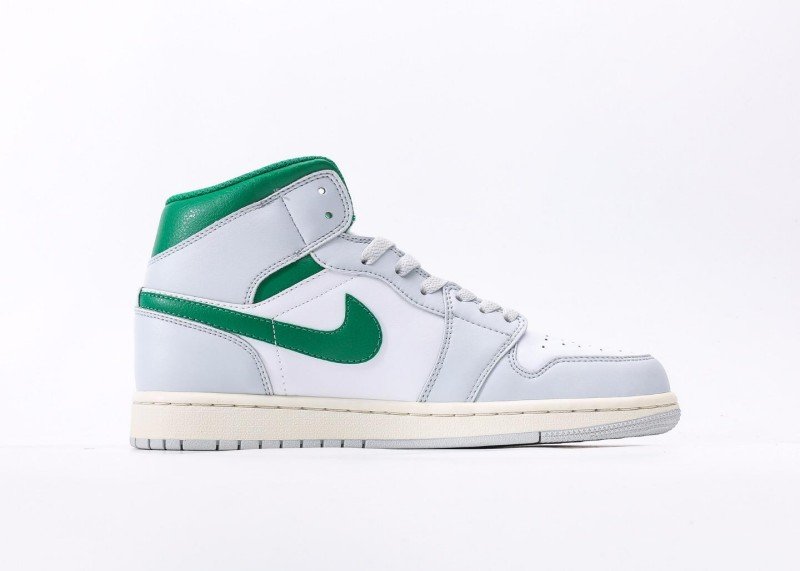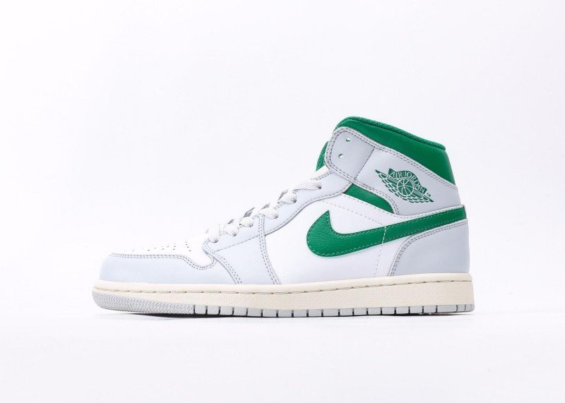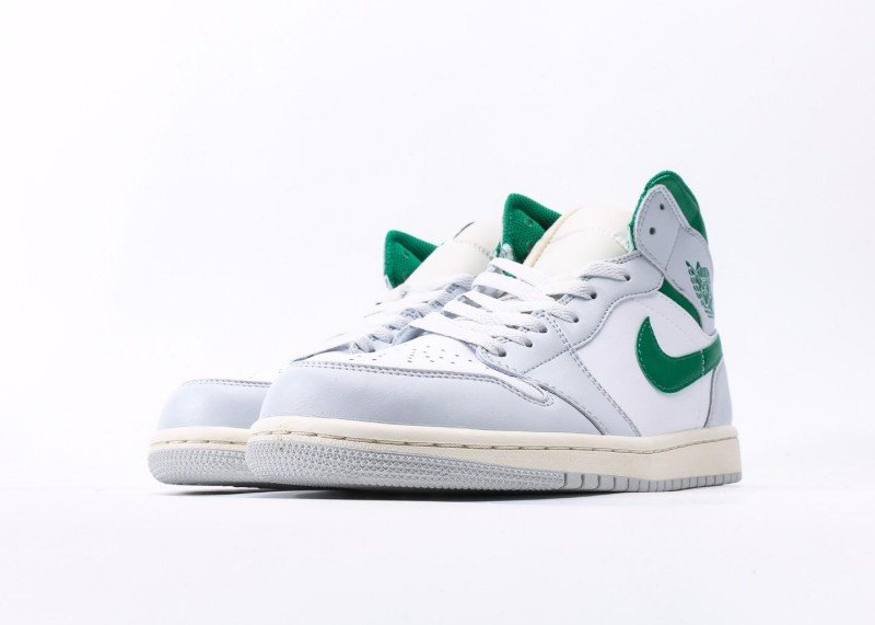 Air Jordan 1 Retro Mid Sneaker features white-green color scheme, reinventing fresh fashion style. White leather upper paired with green Swoosh logo and collar, striking color contrast showcases perfect fusion of energy and nature, suitable for fresh style enthusiasts.