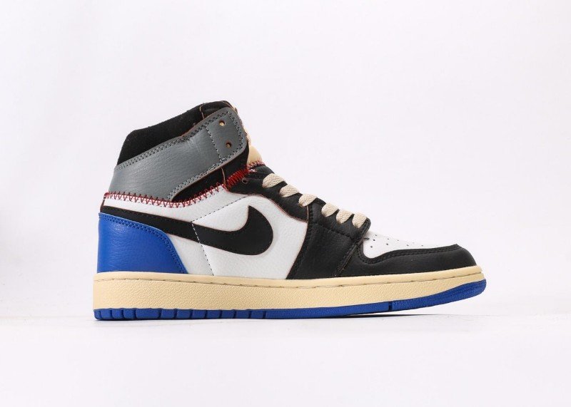 Air Jordan 1 Retro Mid AJ1 Sneaker features black-blue-white-grey color blocking with lightning motif on heel, reinventing street fashion style. Black leather toe cap paired with white mid-panel, grey collar and blue lightning motif creating striking contrast, showcasing perfect fusion of personality and fashion, suitable for style-conscious young people.