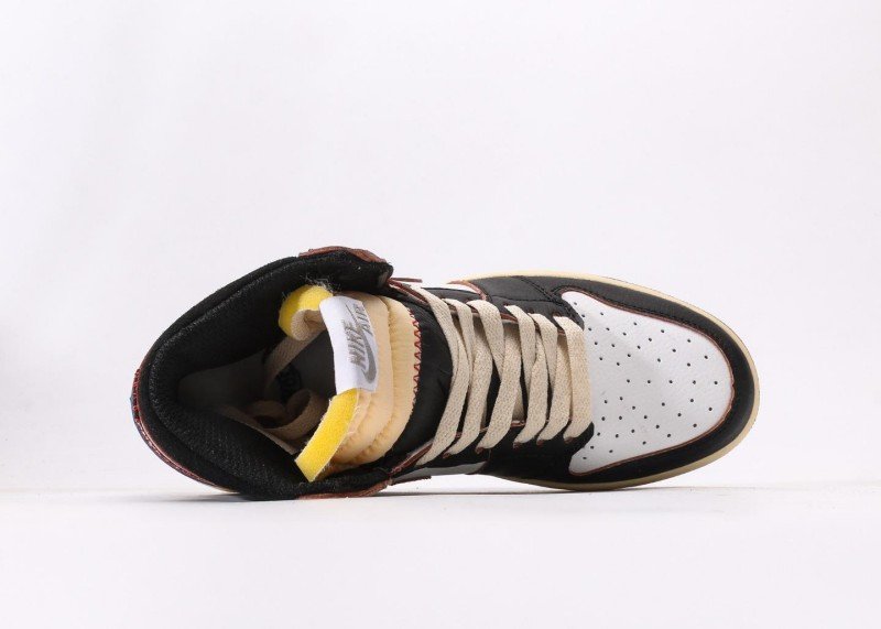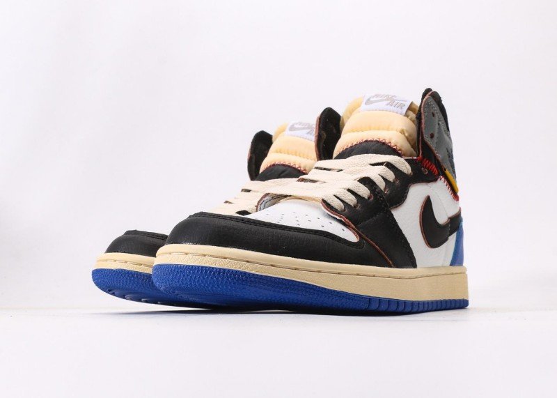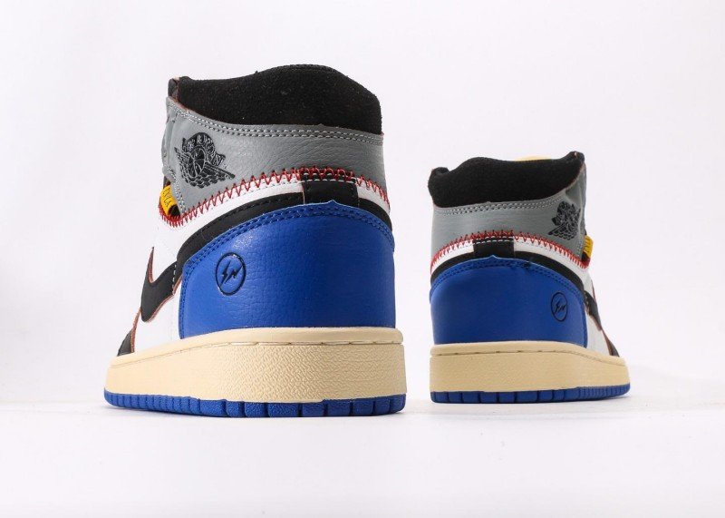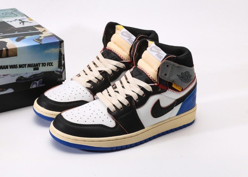 Black Swoosh logo on side with smooth lines, blue lightning motif on lateral heel for bold personality. Red stitching adorns collar edge, yellow tag and black “AIR JORDAN” embroidery adding detail layers. Exquisite multi-material patchwork, bold color matching, overall styling full of street culture vibe.