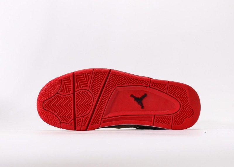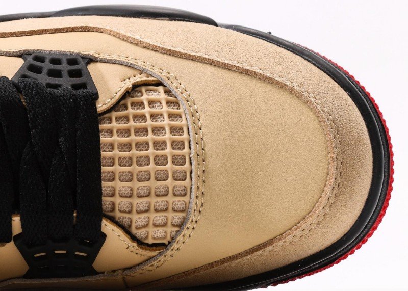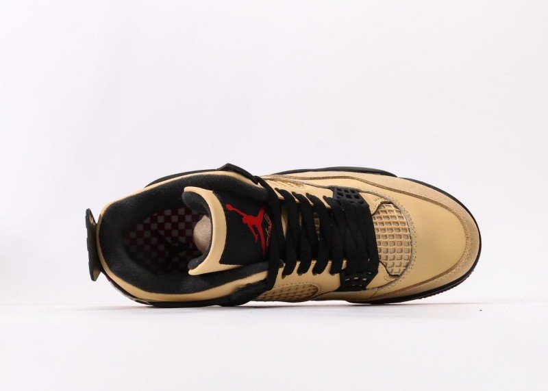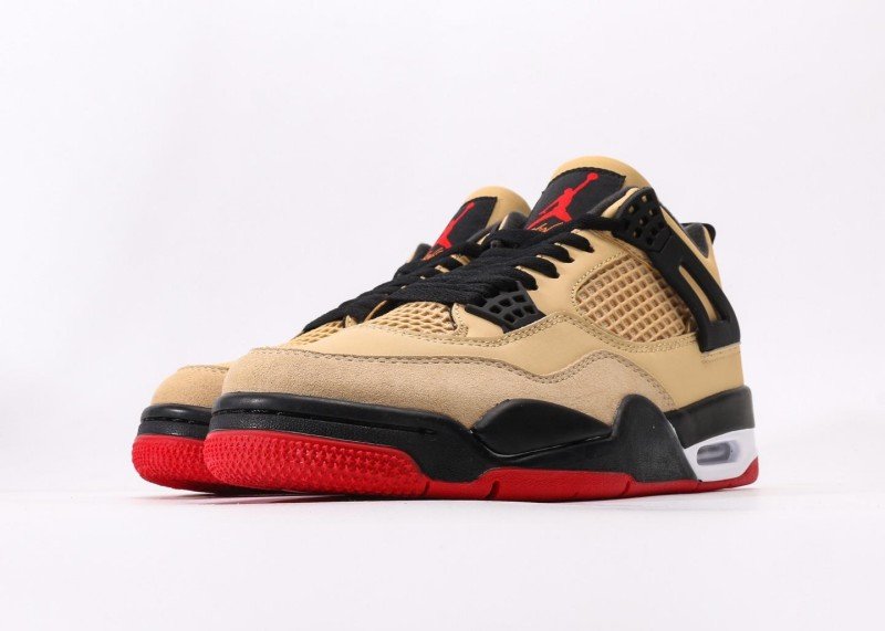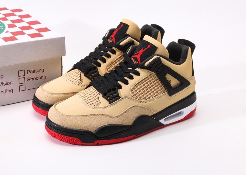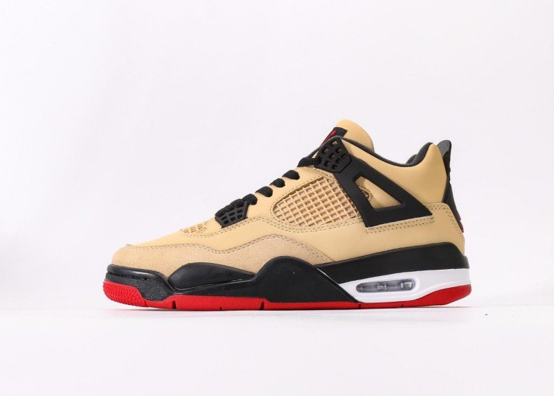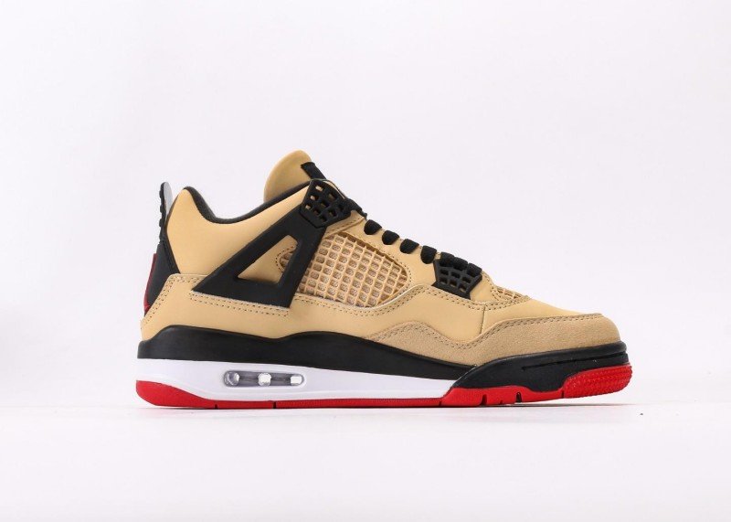 Air Jordan 4 Retro Sneaker features beige-black-red color scheme, reinventing energetic street style. Beige suede upper paired with black mesh panel and red outsole edge, colorblock design showcases perfect fusion of personality and fashion, suitable for trend enthusiasts.