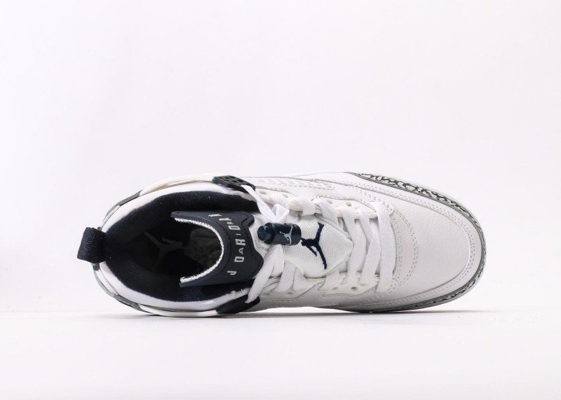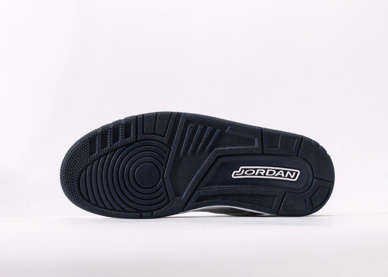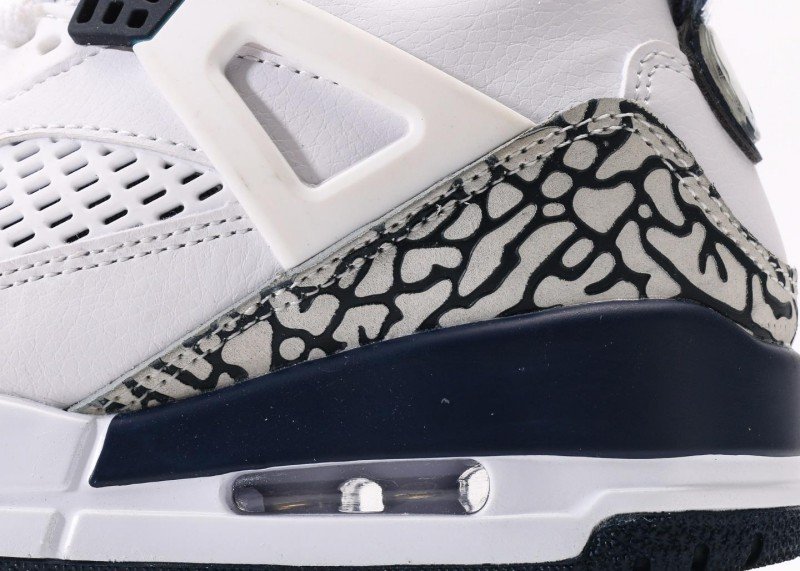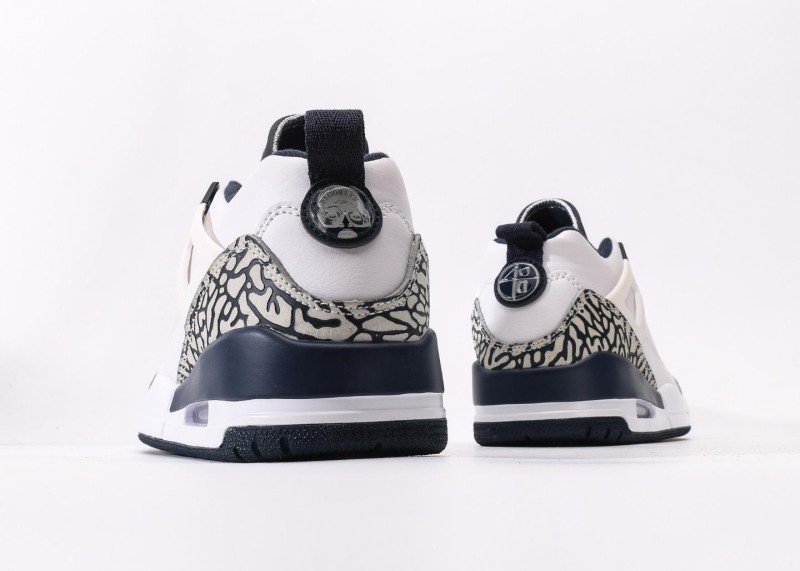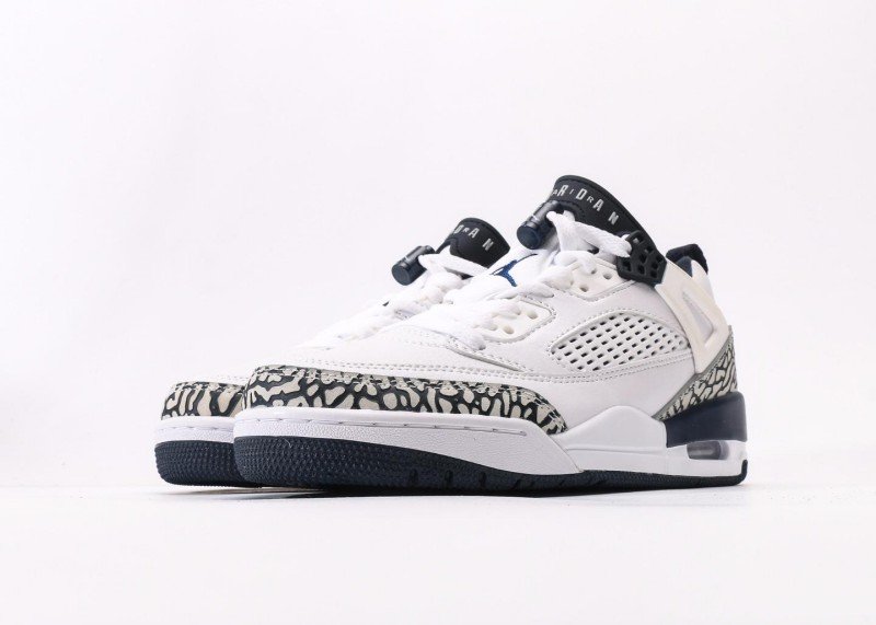 Main upper uses white leather with smooth texture; Black-white crackle toe cap and heel with three-dimensional texture; white mesh panel on side for breathability; navy blue tongue and white laces creating striking contrast; white midsole with navy blue rubber outsole, transparent air unit enhances cushioning, providing excellent grip.