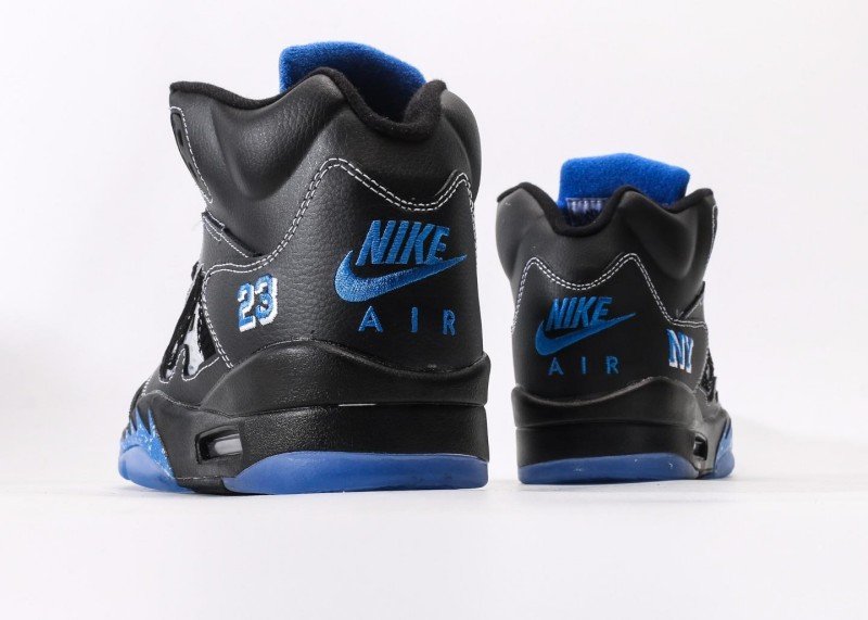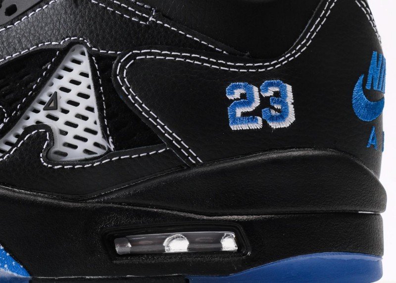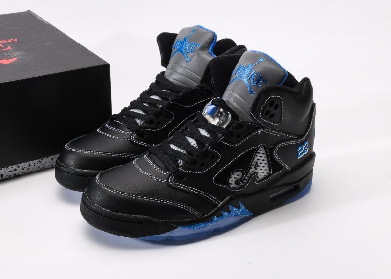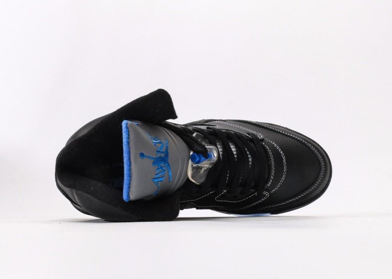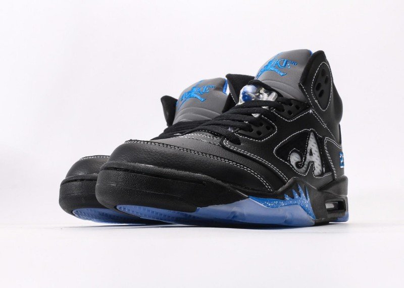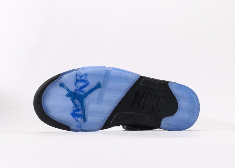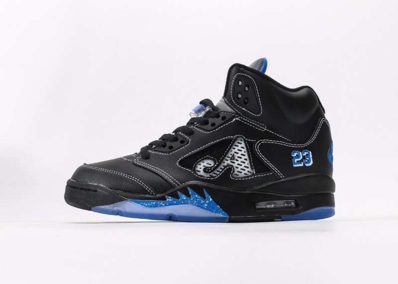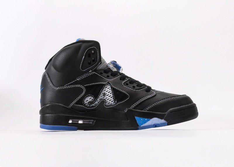 Air Jordan 5 Retro Sneaker features black-blue color scheme, reinventing fashion-forward style. Black leather upper paired with transparent mesh panel and blue details, colorblock design showcases perfect fusion of personality and fashion, suitable for trend enthusiasts.