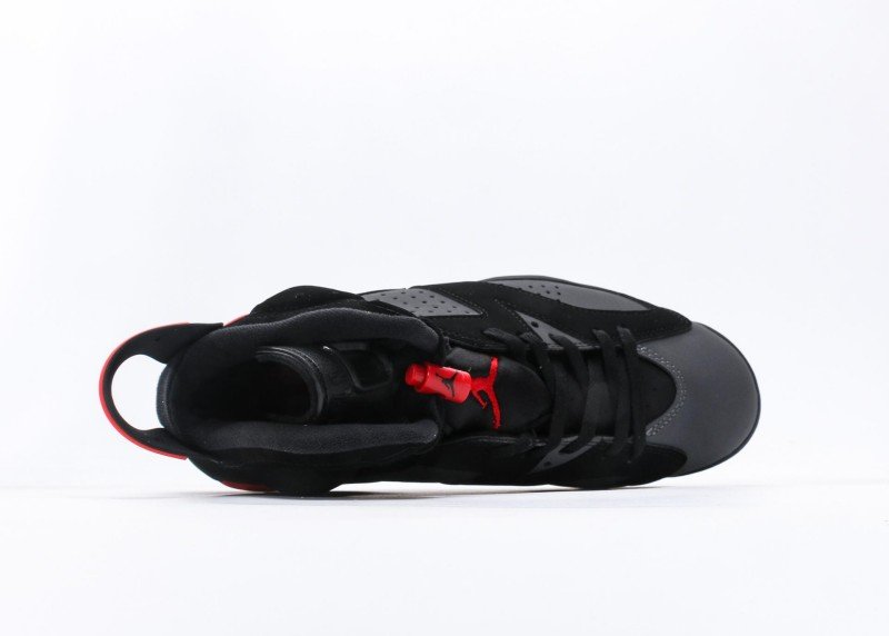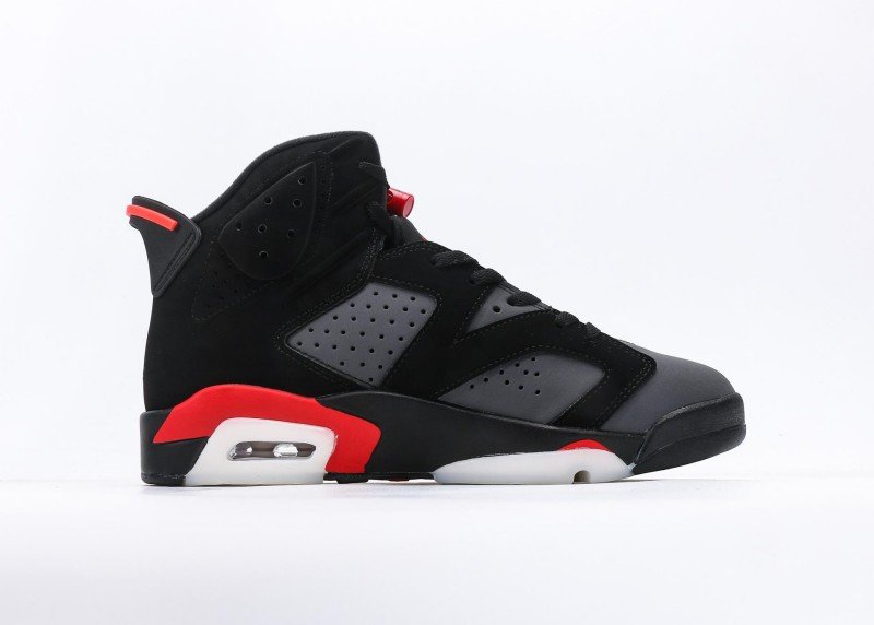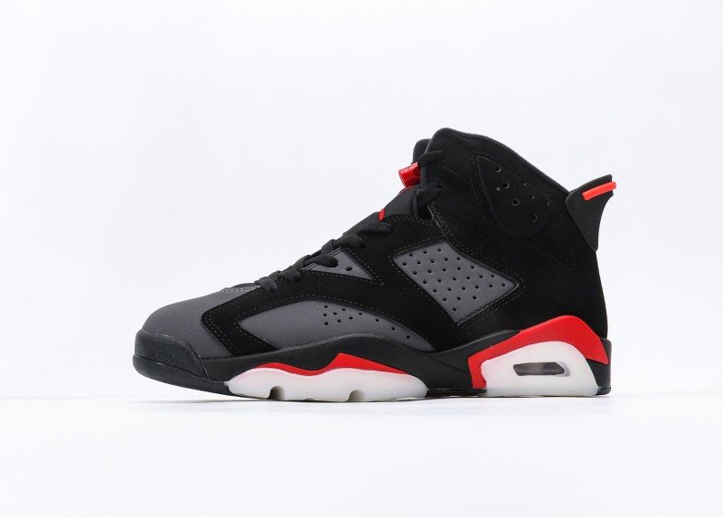 Air Jordan 6 Retro Sneaker features black-gray-red color scheme, reinventing fashion-forward style. Black leather upper paired with gray mesh panel and red details, colorblock design showcases perfect fusion of personality and fashion, suitable for trend enthusiasts.