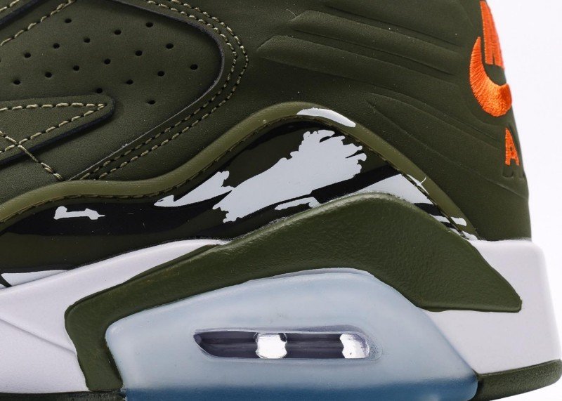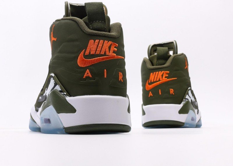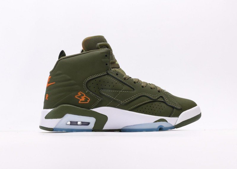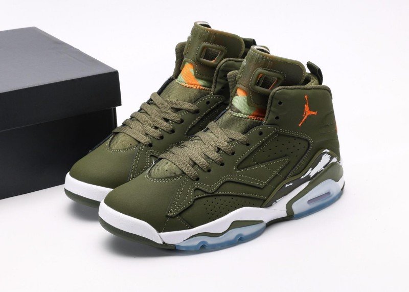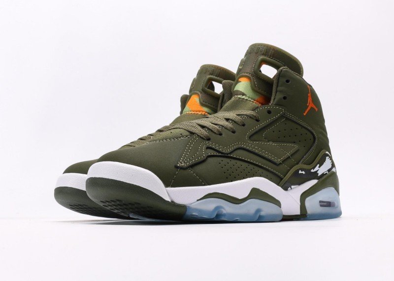 Main upper uses olive green leather with smooth texture; olive green mesh panel on side for breathability; orange Jumpman logo and white midsole creating striking contrast; olive green rubber outsole with white midsole, transparent air unit enhances cushioning, providing excellent grip.