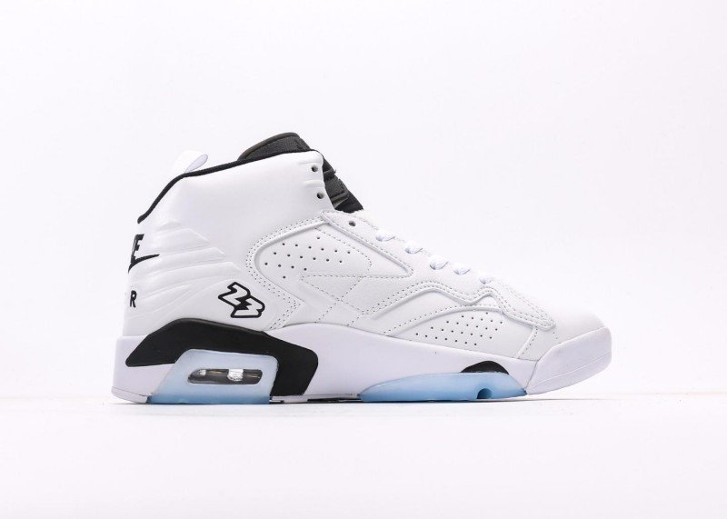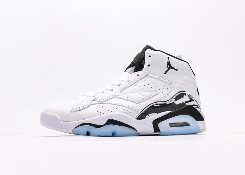 Main upper uses white leather with smooth texture; white mesh panel on side for breathability; black Jumpman logo and black accents creating striking contrast; black rubber outsole with white midsole, transparent air unit enhances cushionin设置产品图片g, providing excellent grip.