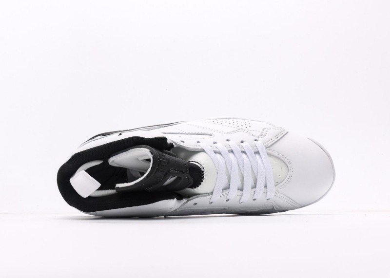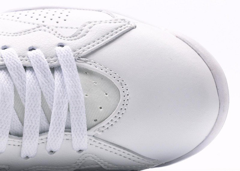 White mesh panel on side with smooth lines, harmonizing with white leather. Black Jumpman logo and black accents with exquisite details, echoing black outsole. White laces harmonize with white upper, black outsole with white midsole for classic color matching, overall design simple yet layered, highlighting brand craftsmanship.