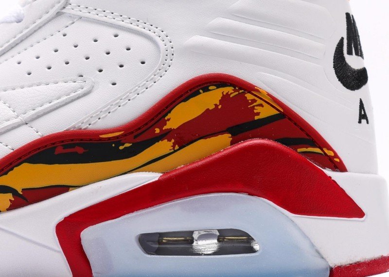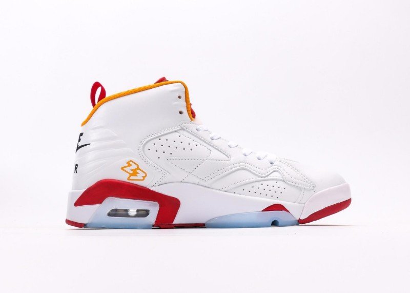 Main upper uses white leather with smooth texture; white mesh panel on side for breathability; red Jumpman logo and yellow accents creating striking contrast; red rubber outsole with white midsole, transparent air unit enhances cushioning, providing excellent grip.
