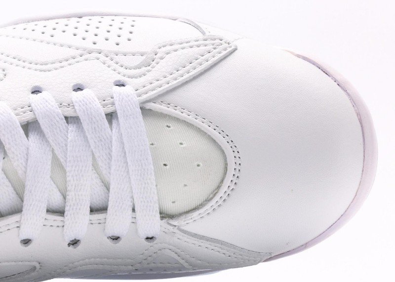White mesh panel on side with smooth lines, harmonizing with white leather. Red Jumpman logo and yellow accents with exquisite details, echoing red outsole. White laces harmonize with white upper, red outsole with white midsole for classic color matching, overall design simple yet layered, highlighting brand craftsmanship.
