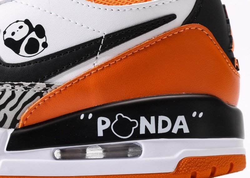 Lifelike panda embroidery on side, “PANDA” lettering on heel, orange accents contrast with black-white panda elements for fashionable vitality.