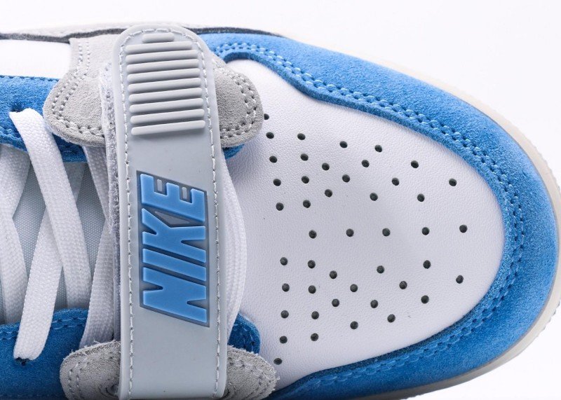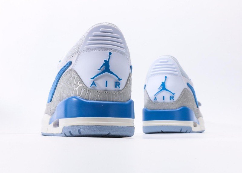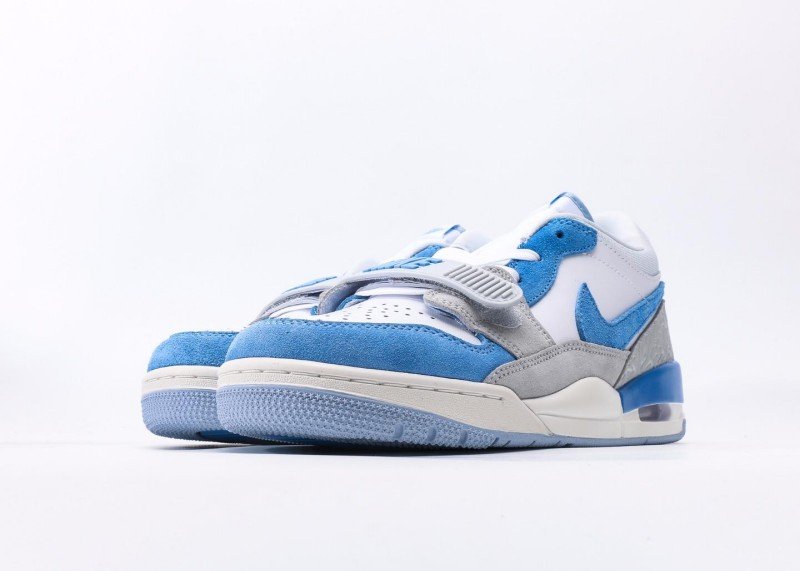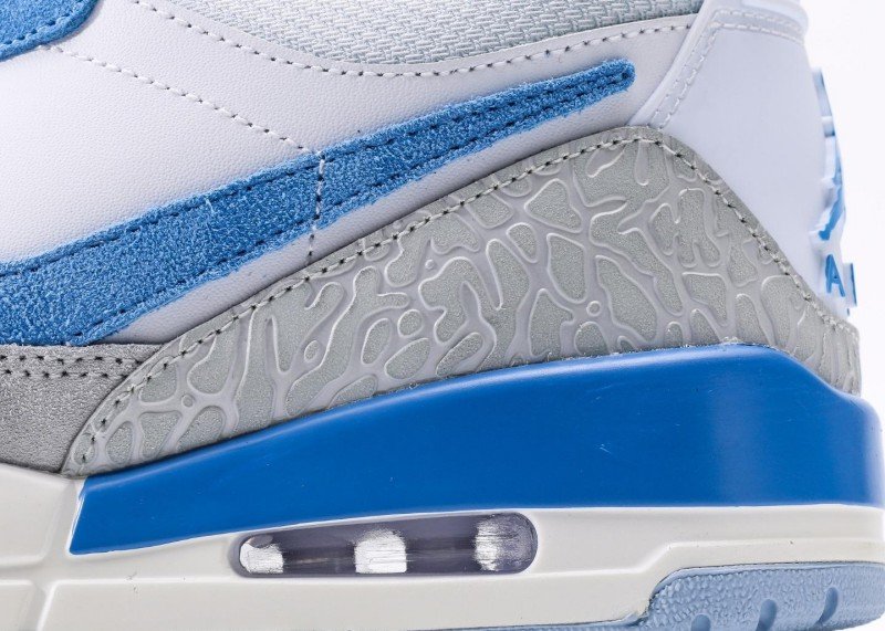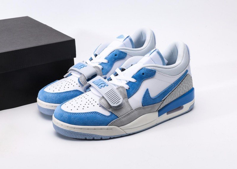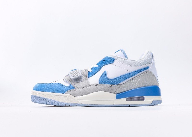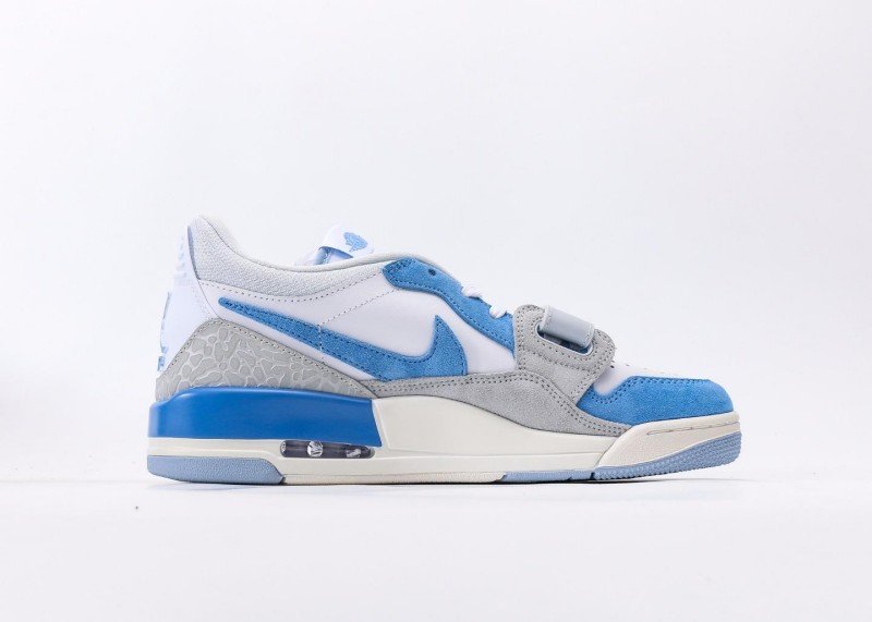 Air Jordan Legacy 312 Low White Blue Grey Sneaker reinvents classic with fresh colorway, featuring grey cement texture and blue panel for unique street style.