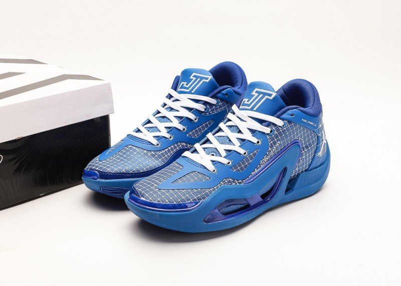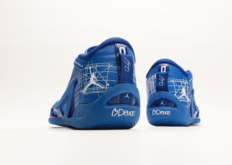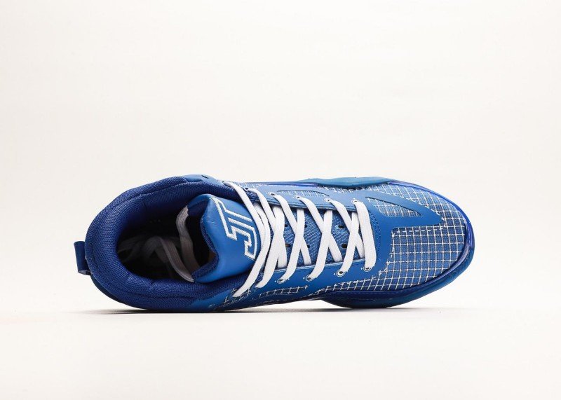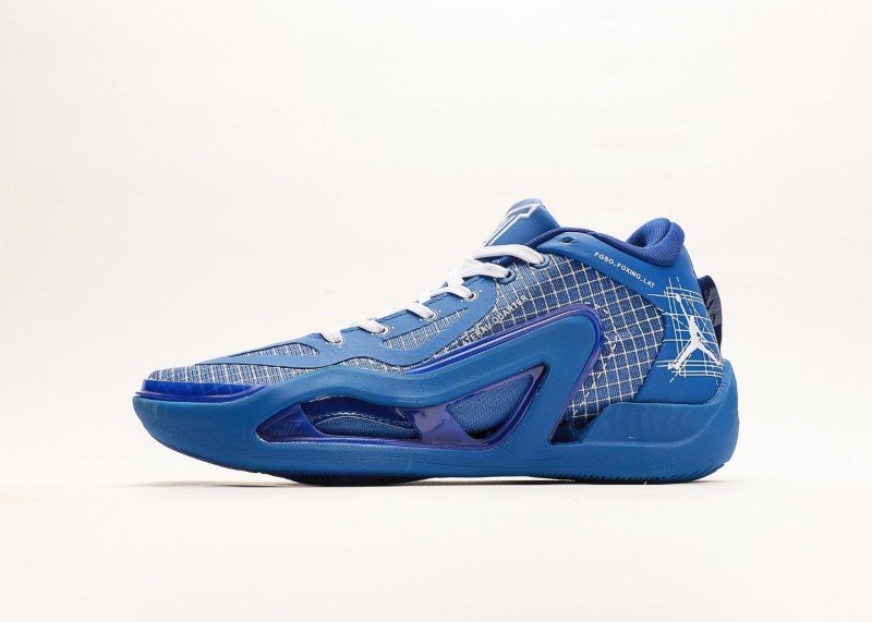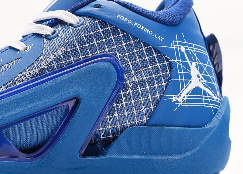 Air Jordan XXXVII PF All Blue Sneaker reinvents future style with tech-inspired all-blue colorway, featuring blue mesh and white grid pattern for unique basketball style.