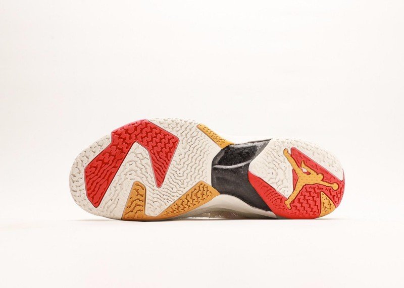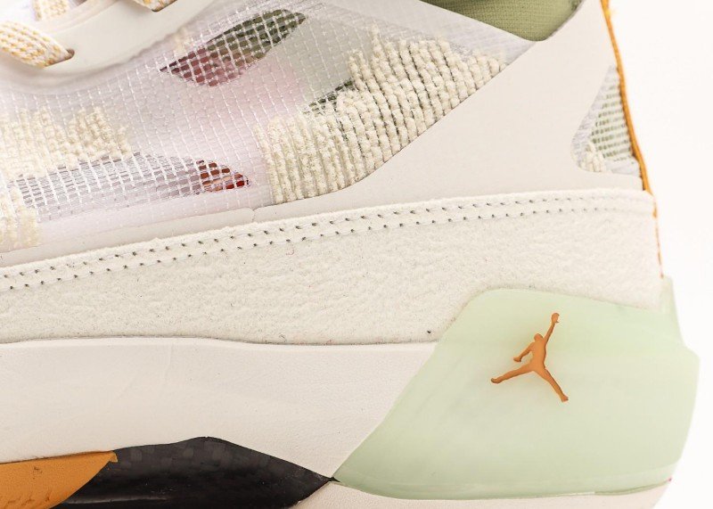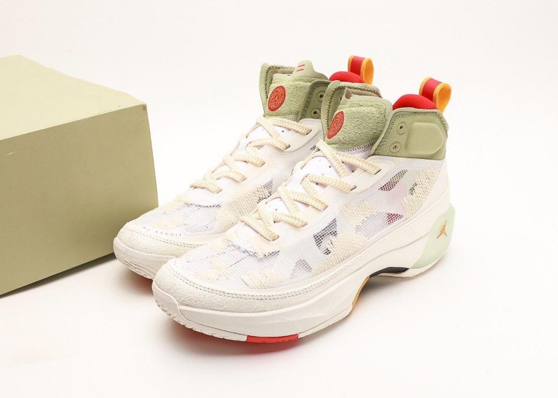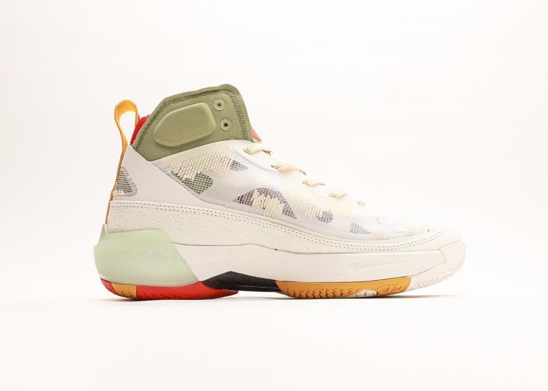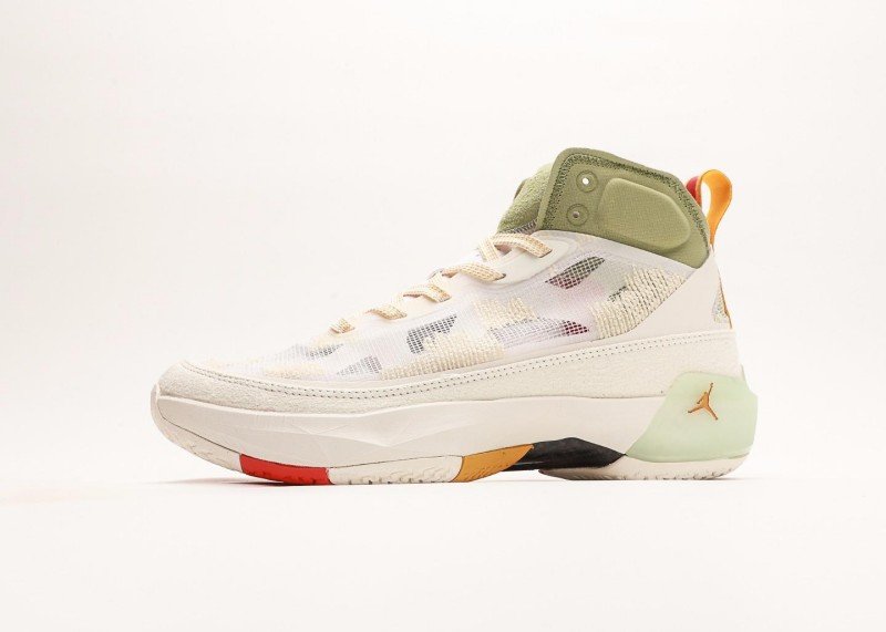 Air Jordan XXXVII PF Cream Green Sneaker reinvents classic with fresh colorway, featuring colorful geometric pattern and green panel for unique sports style.