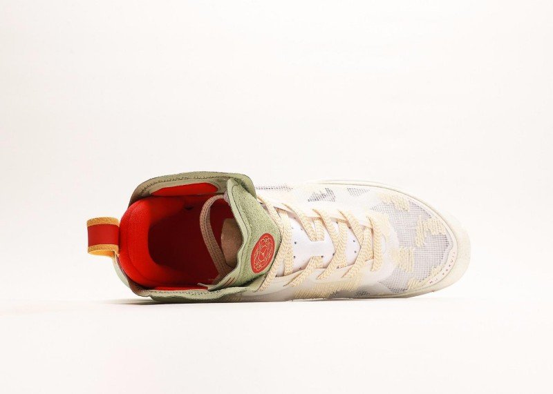 Colorful geometric pattern harmonizes with cream upper, green panel echoes green outsole, high-top design supports ankle, showcasing brand craftsmanship.