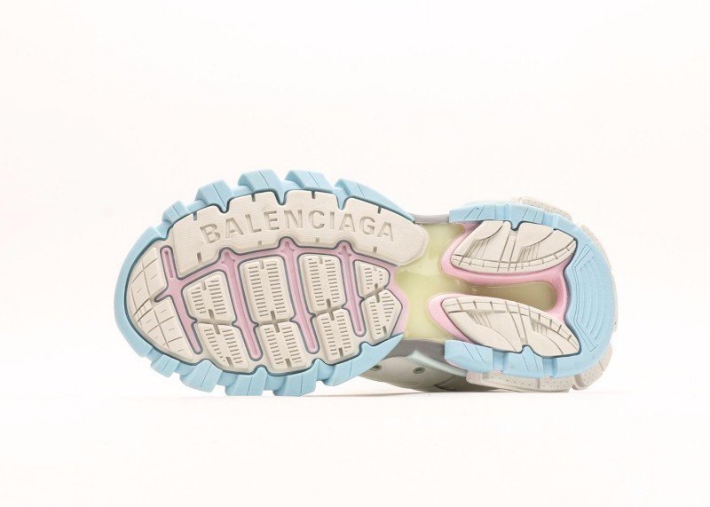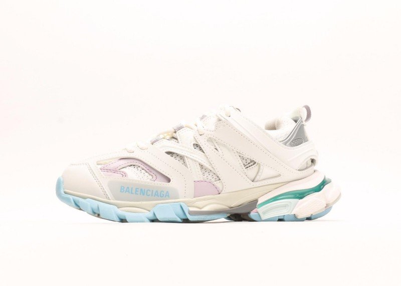 White mesh with purple/blue leather panels, bold blue BALENCIAGA lettering, hollow design enhances breathability, multi-material拼接 highlights luxury craftsmanship with sweet outdoor aesthetics.