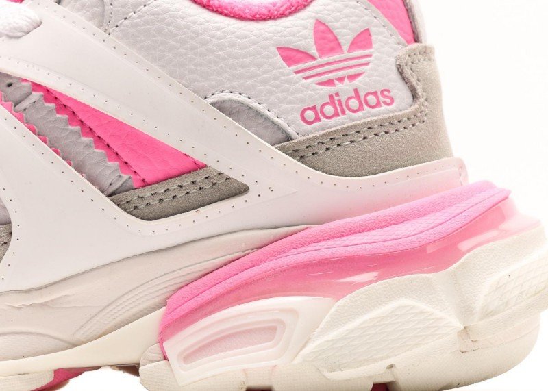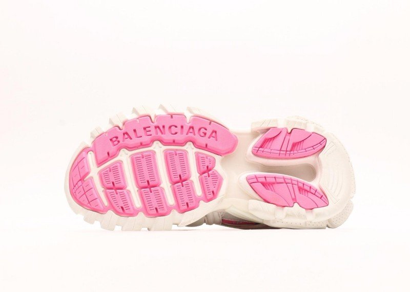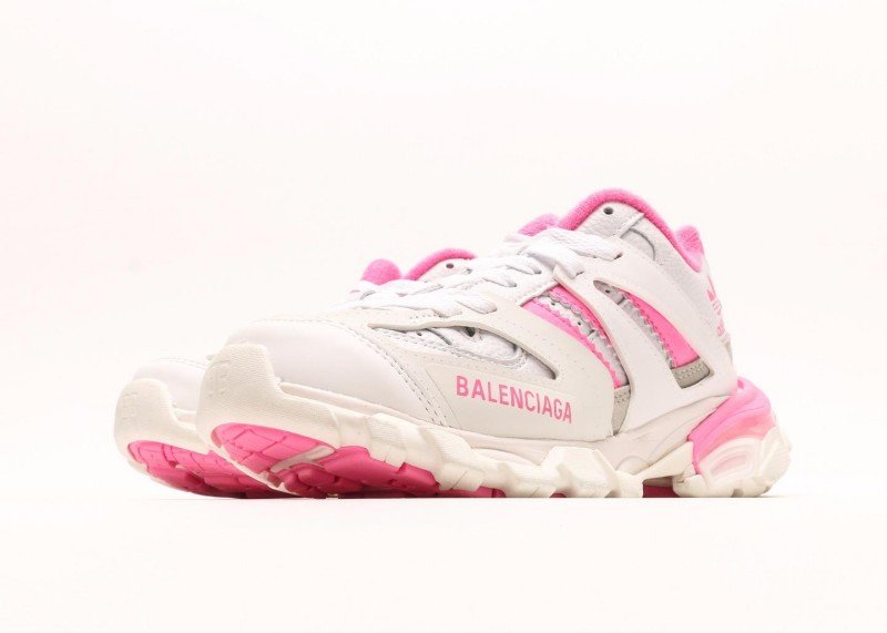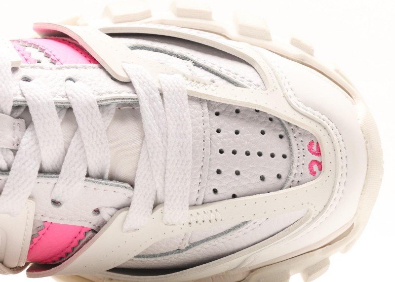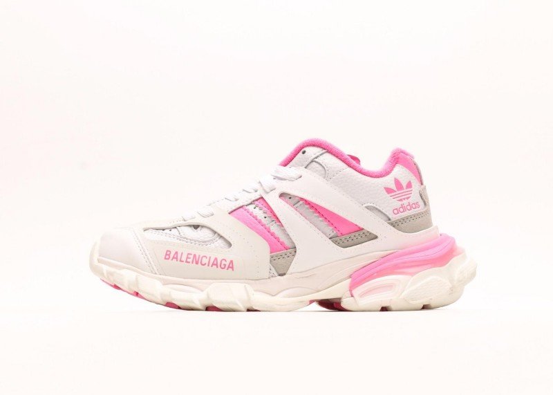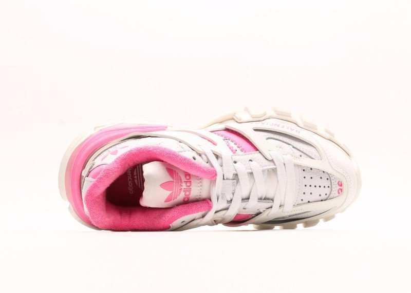White mesh with pink leather panels, bold pink BALENCIAGA lettering and Adidas Trefoil logo, hollow design enhances breathability, dual-brand elements integrated seamlessly with artisanal stitching.