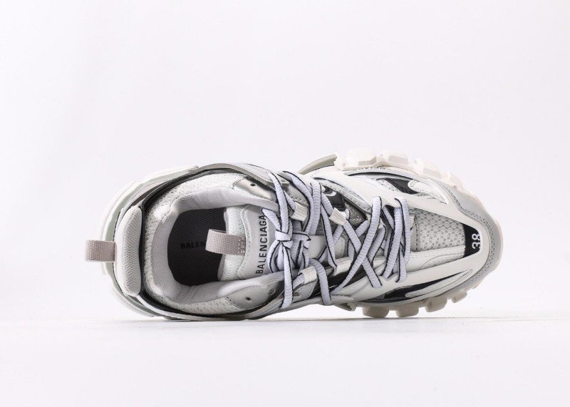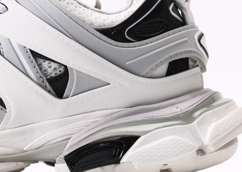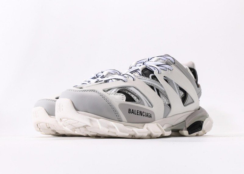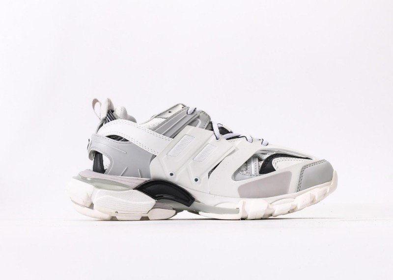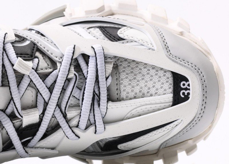 White mesh with gray/black leather panels, gray BALENCIAGA lettering,镂空结构 enhances breathability, multi-material拼接 highlights luxury craftsmanship, retro style meets functionality with pristine finish.