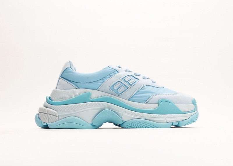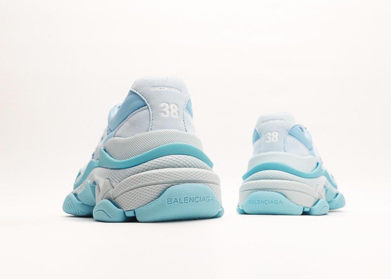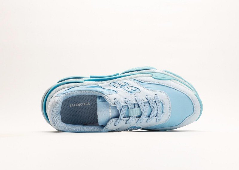 Balenciaga Triple-S Sneaker featuring six-layer sole construction, light blue gradient upper with white paneling, complete with original craft box, supported by official factory archives.