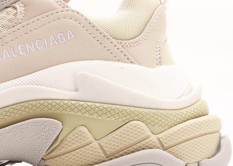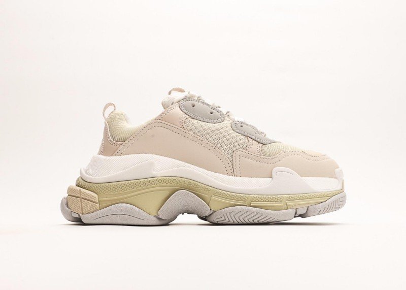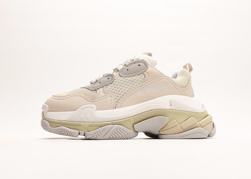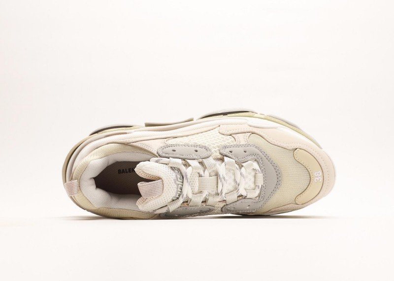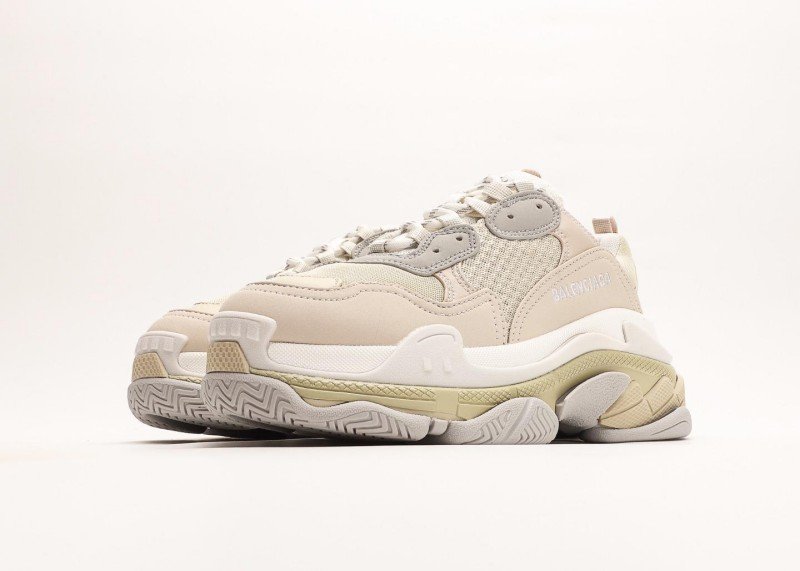 Balenciaga Triple-S Sneaker featuring six-layer sole construction, cream-gray patchwork upper with mesh panels, complete with original craft box and factory archives.