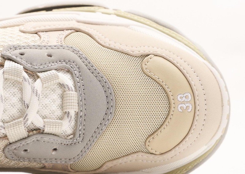 Cream leather and gray mesh breathable panels, clear BALENCIAGA lettering, six-layer sole providing 6cm elevation, handcrafted details highlighting luxury craftsmanship.