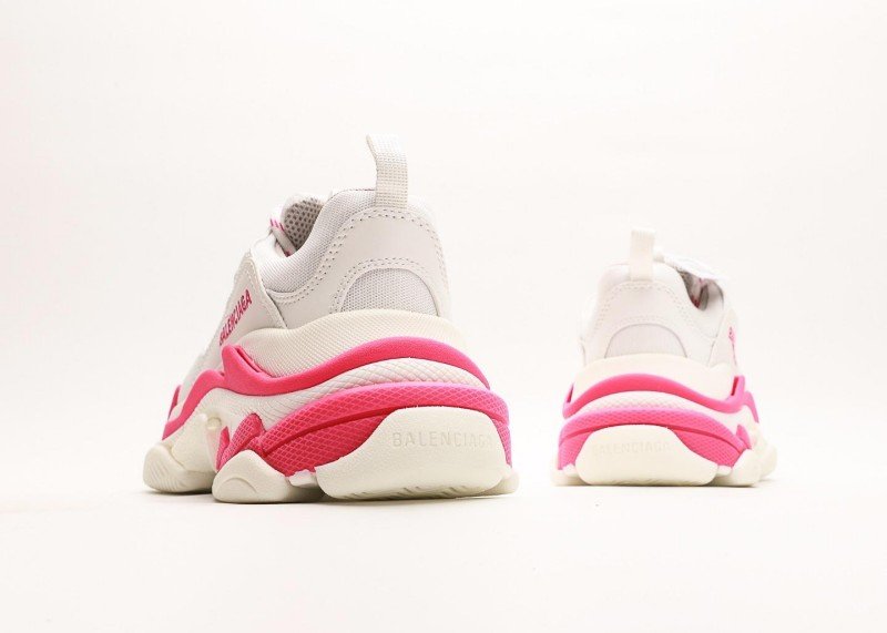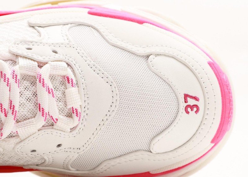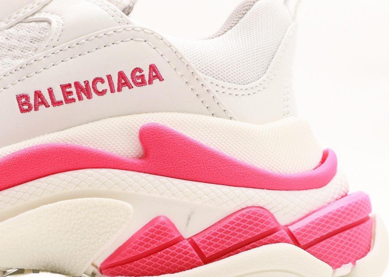 White leather and pink mesh breathable panels, vibrant pink BALENCIAGA lettering, six-layer sole providing 6cm elevation, handcrafted details highlighting luxury craftsmanship.