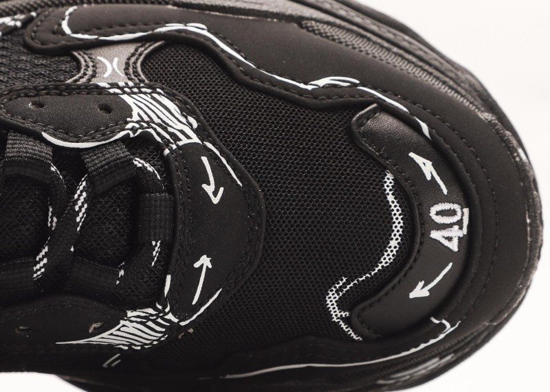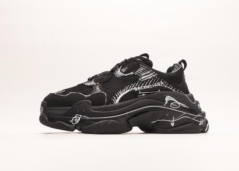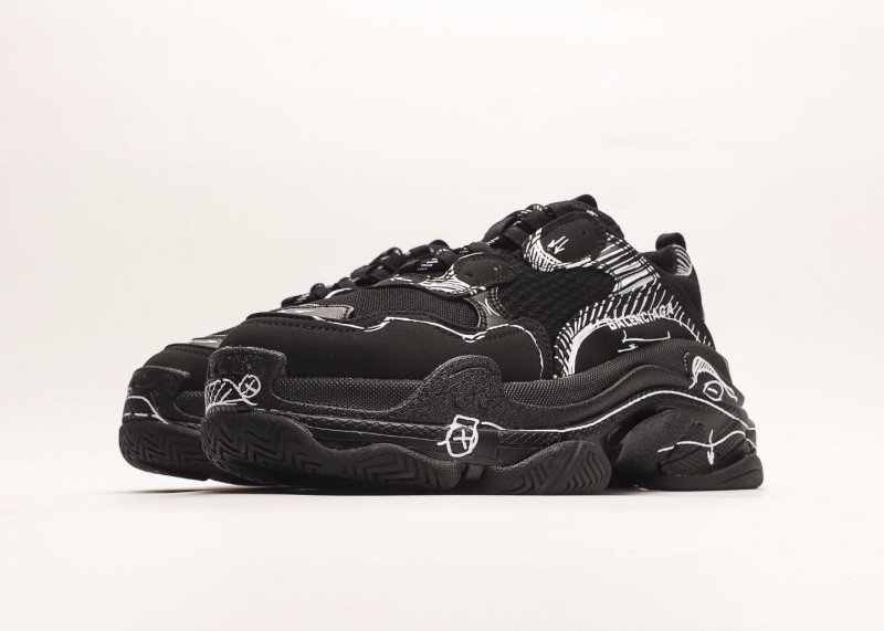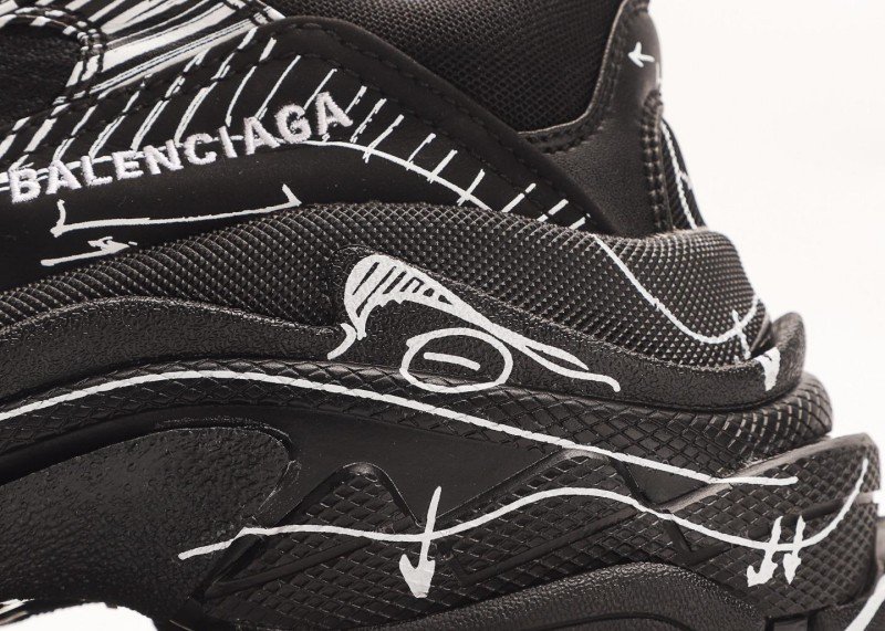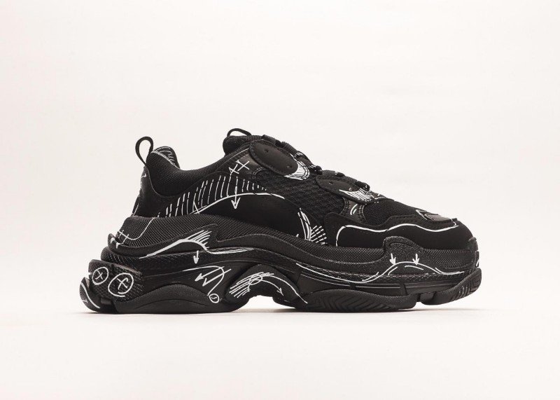 Balenciaga Triple-S Sneaker featuring six-layer sole construction, all-black upper with white graffiti lines, complete with original craft box and factory documentation.