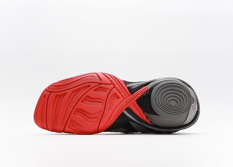 Black nano-tech upper with red muscle-inspired panels, silver accents define structure, asymmetric mesh optimizes breathability, leather-free construction enhances biological mobility, 1:1 counter details restored.