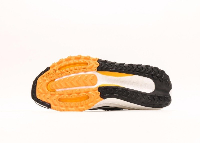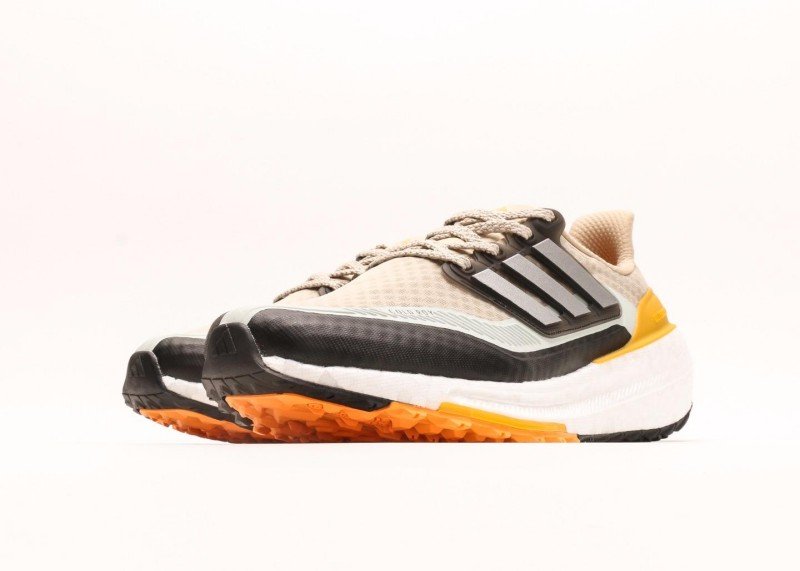 Three silver diagonal stripes highlight brand genes, yellow brand series logo adorns shoe side, orange anti-slip texture echoes yellow decorative strip, creating clear design layers.
