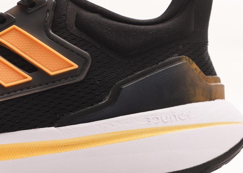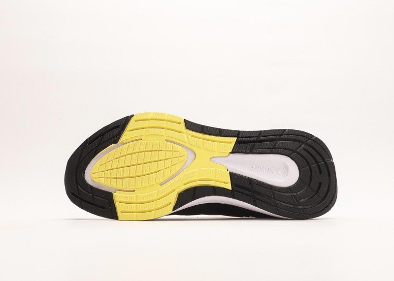 The black hard material at the heel provides stable support, with white “BOOST” printed on the side, highlighting cushioning technology. The sole has a clear hierarchy, with white midsole paired with yellow decorative strips and black edging for durability.