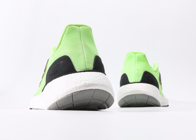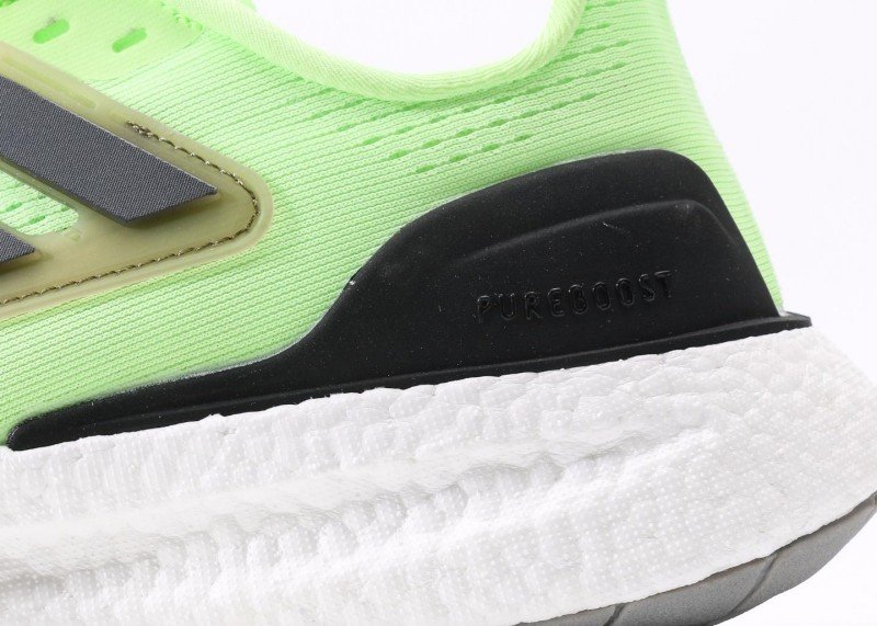 Black stripes covered by transparent material enhance design layering. Bright green laces echo the upper color, five pairs of eyelets for easy adjustment. Black heel stabilizer with white brand text彰显 quality.