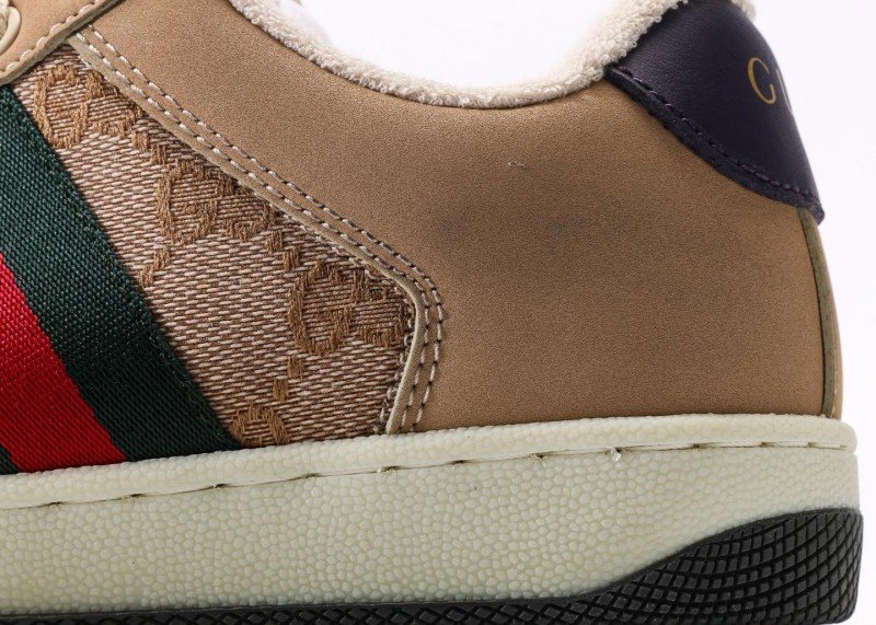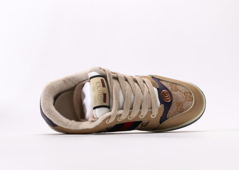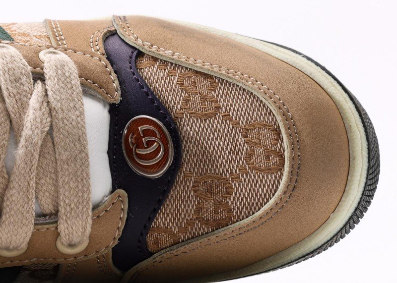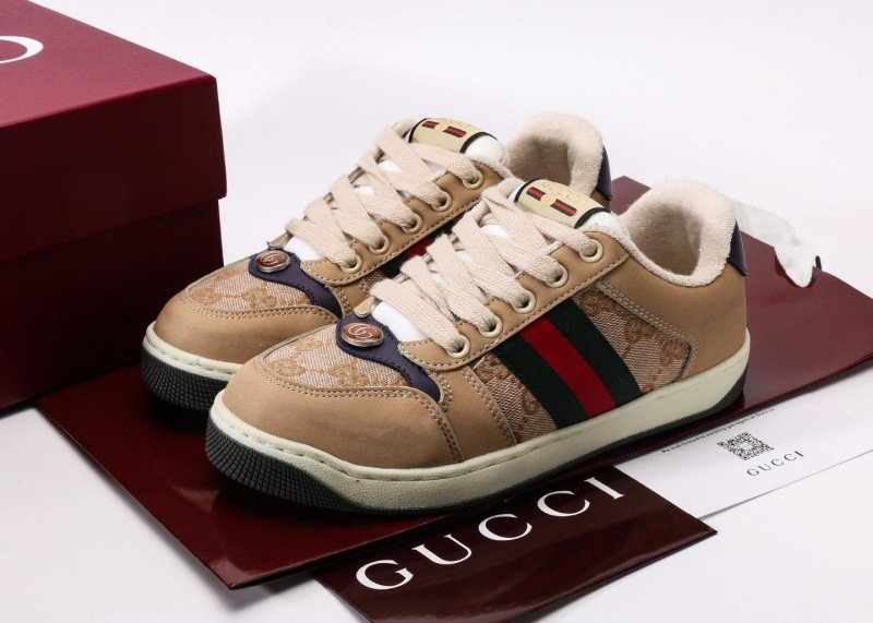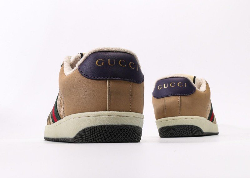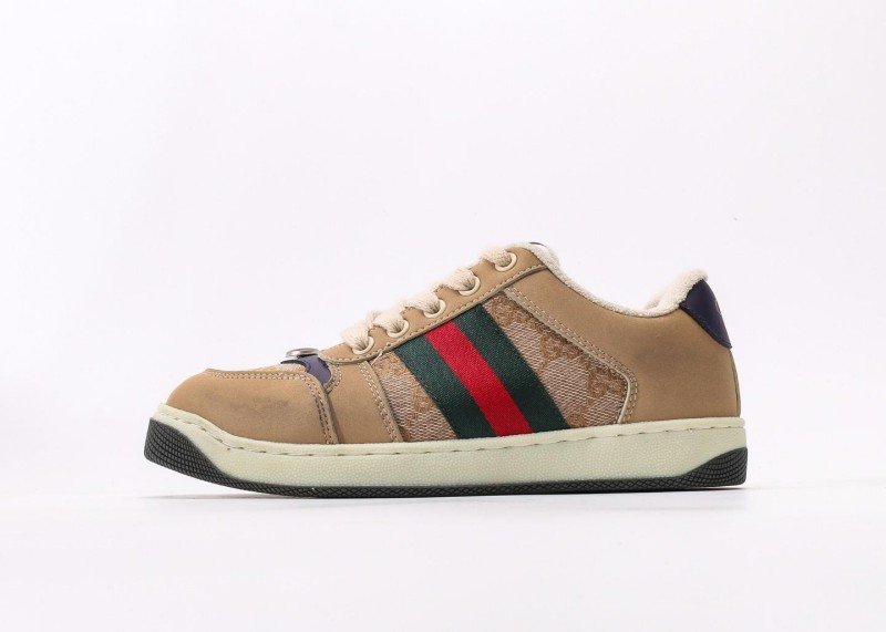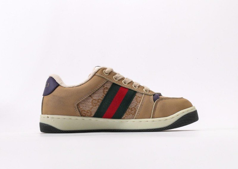 GUCCI 25 New Light Brown Double G Stripe Trainer Shoes focus on retro sports aesthetics, creating a lightweight and breathable couple’s shoe essential for spring. The light brown upper uses imported suede material with a soft and delicate touch, paired with classic red-green web stripes on the side, instantly awakening the brand’s iconic visual memory.