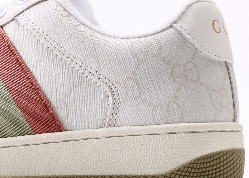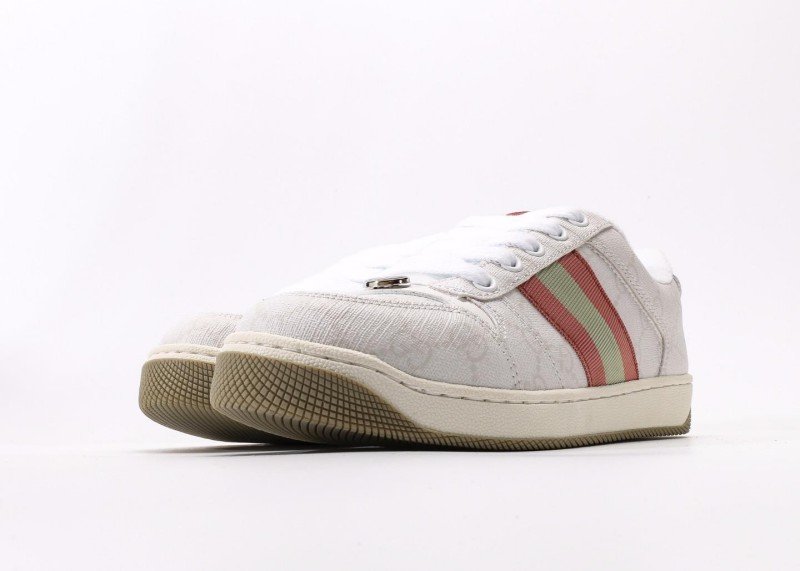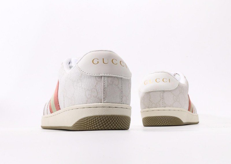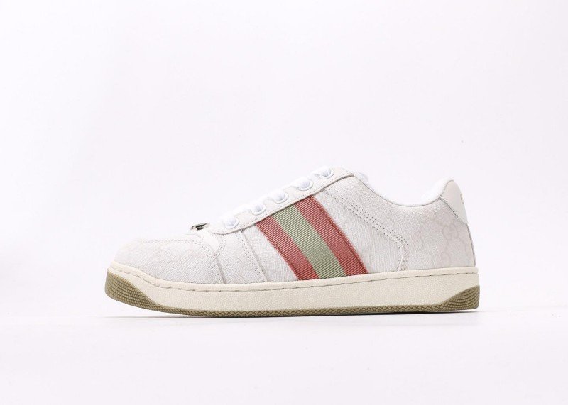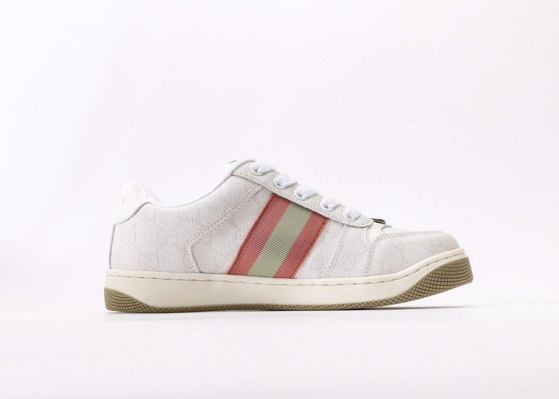 GUCCI 25 new model white trainer sneakers combine classic design with modern elements, featuring white main body with red and green stripe decoration, GG pattern all over the shoe body, showing brand’s fashion aesthetics.
