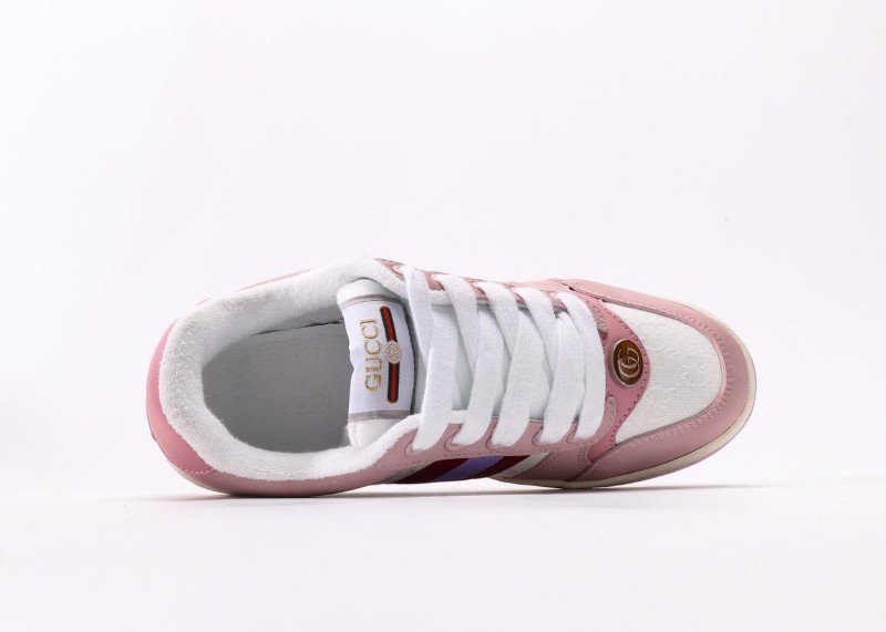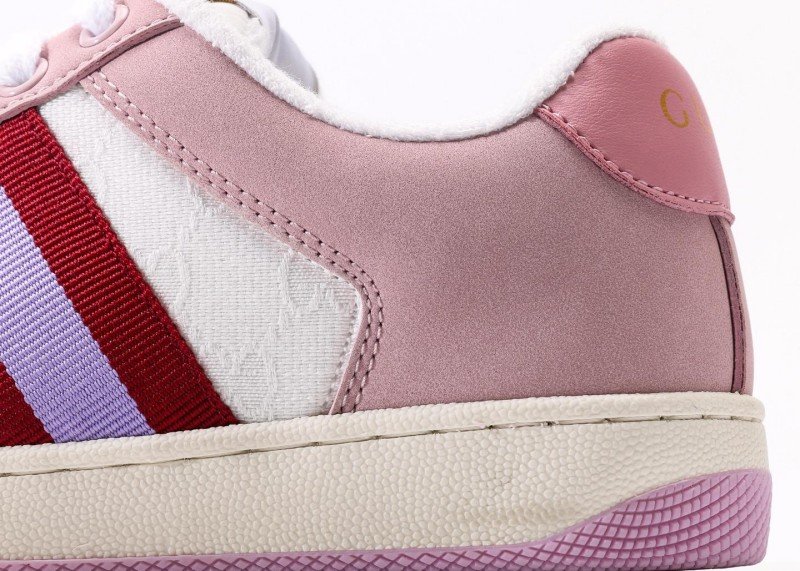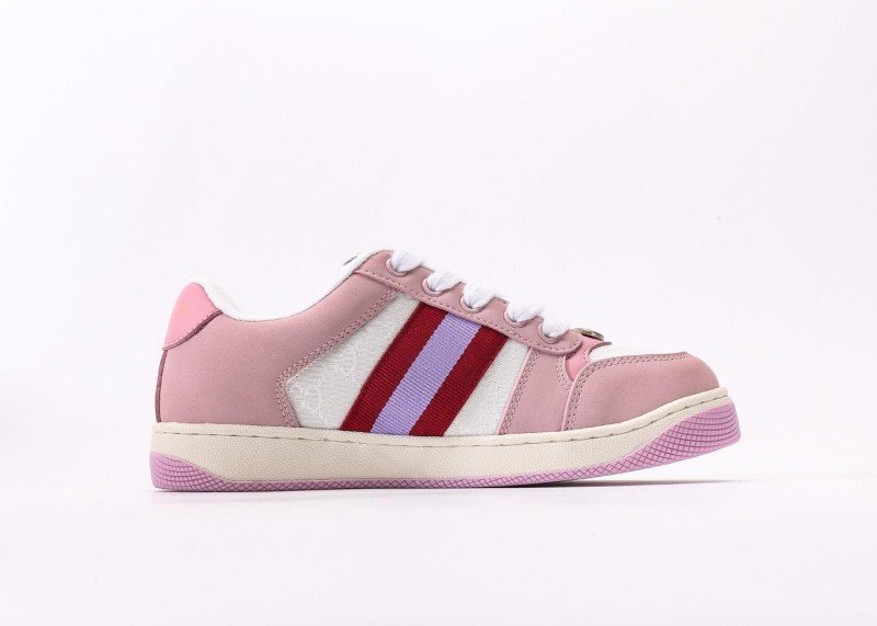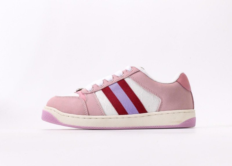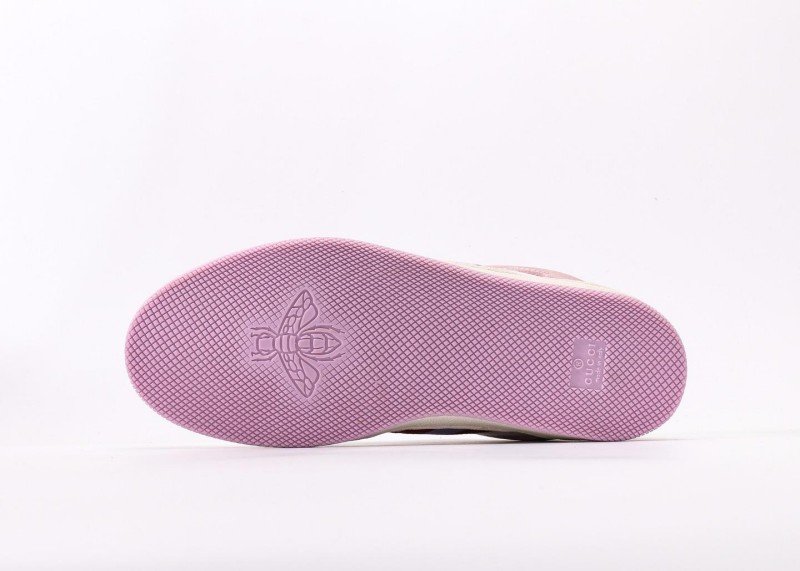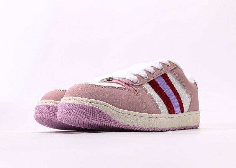 GUCCI 25 New Pink Stripe Trainer Shoes focus on sweet girly style, creating a must-have fashion casual shoe for spring. The upper uses soft pink suede material with a delicate and soft touch, paired with side red-white-purple three-color stripe web tape, instantly brightening the overall look and showing youthful vitality.