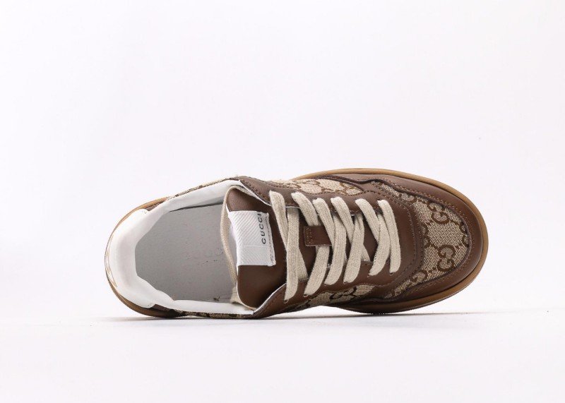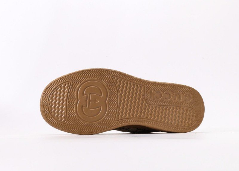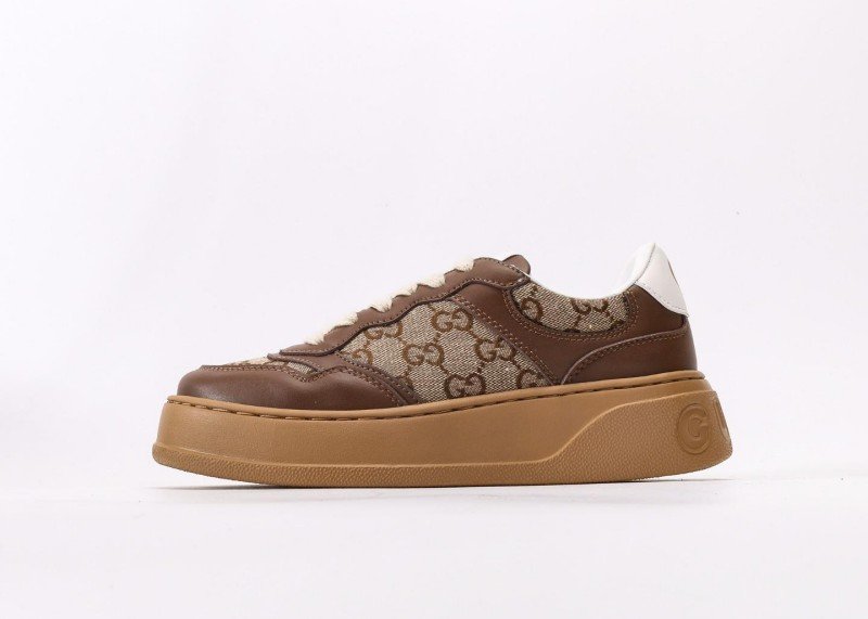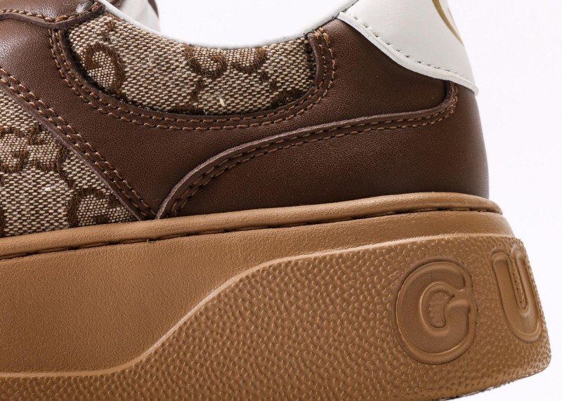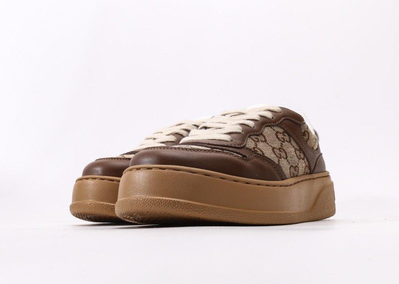 GUCCI 25 New Brown GG Platform Trainer Shoes infuse classic design with modern flair, creating a couple’s sneaker that blends vintage charm with contemporary style. The upper combines brown calf leather and beige GG canvas, with the leather portion treated via aniline dyeing for a naturally delicate sheen, while the canvas utilizes 8oz heavy cotton-linen blend fabric for structural integrity and breathability.