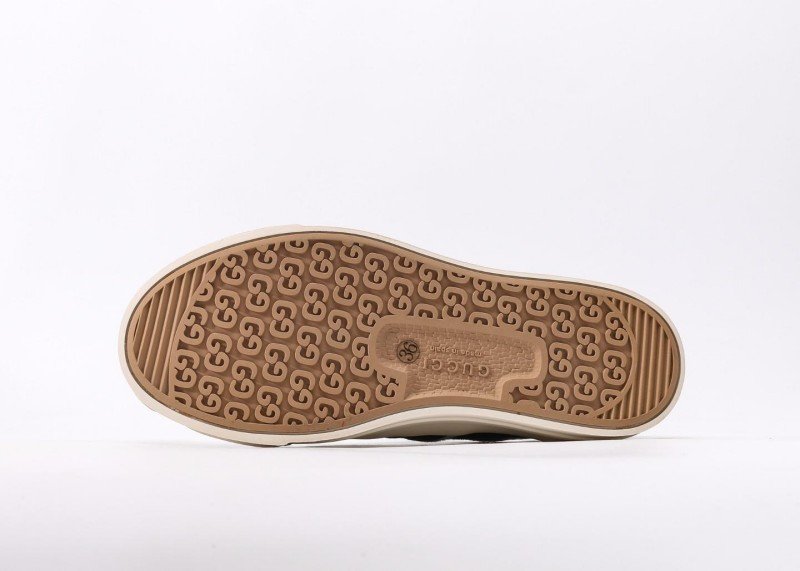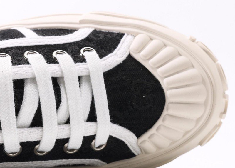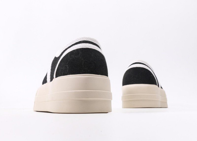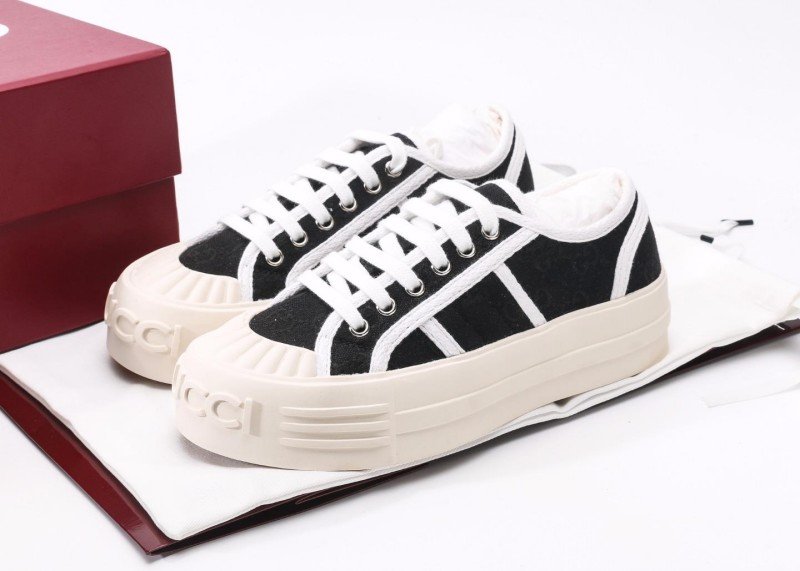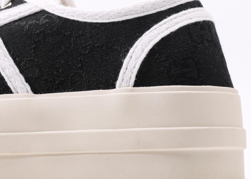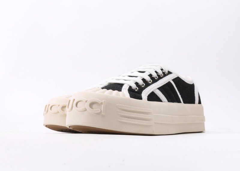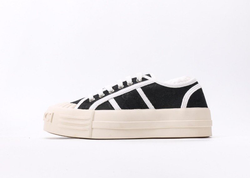 Gucci Black Cookie Sneaker features classic GG pattern with black upper and three white stripes, complemented by “CCI” embossed toe cap and beige platform sole, embodying retro sporty aesthetics.