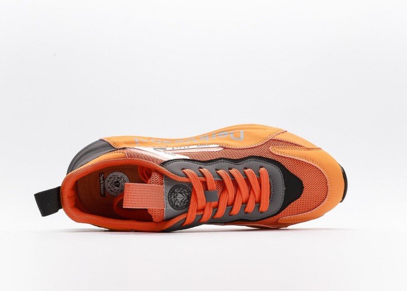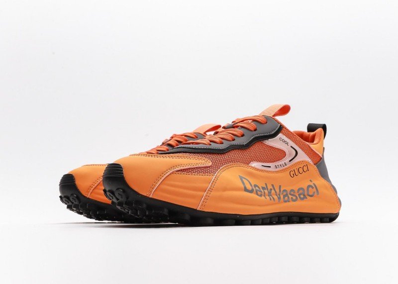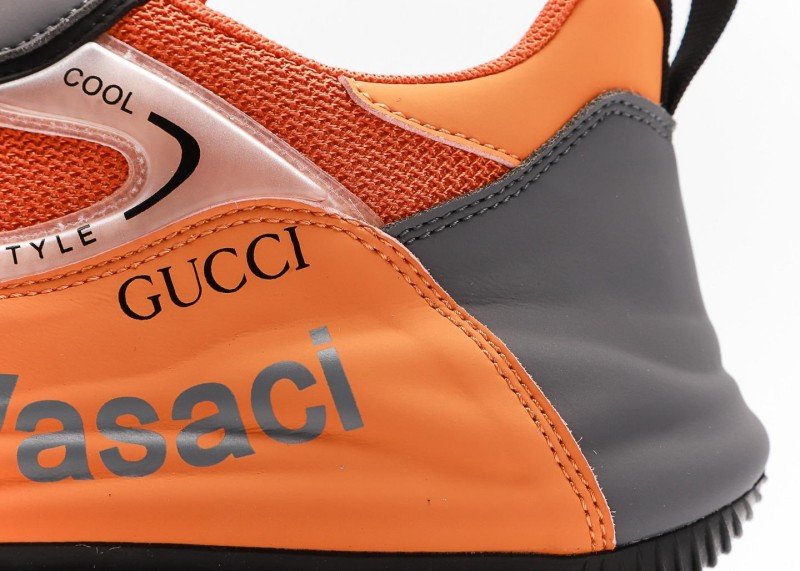 Gucci Distressed Screener sneakers feature a vibrant orange color scheme with gray and black accents, breathable mesh upper, and “DerkVasaci” gray lettering with black “GUCCI” logo on the side, showcasing unique design.
