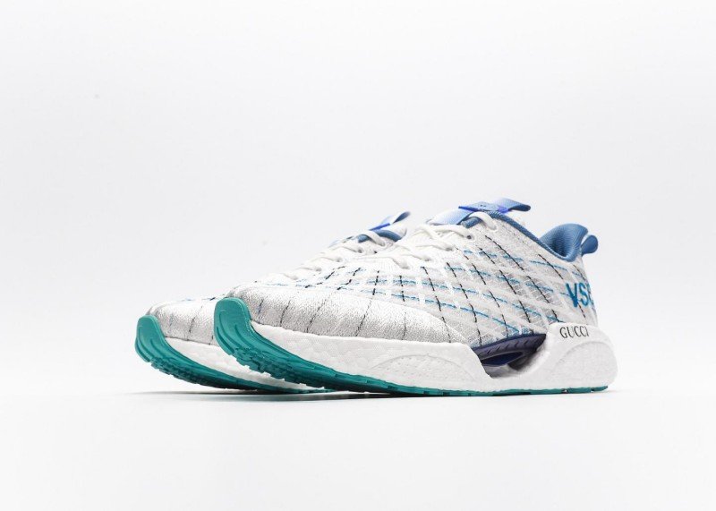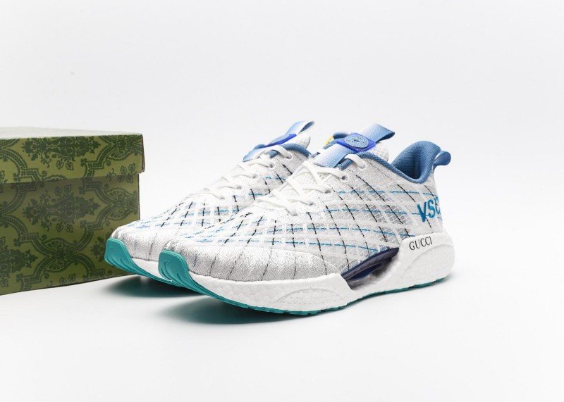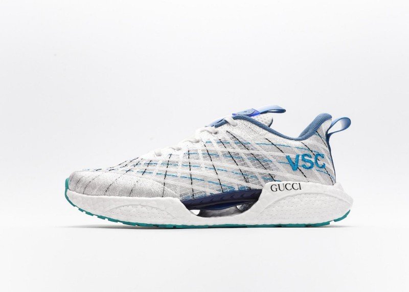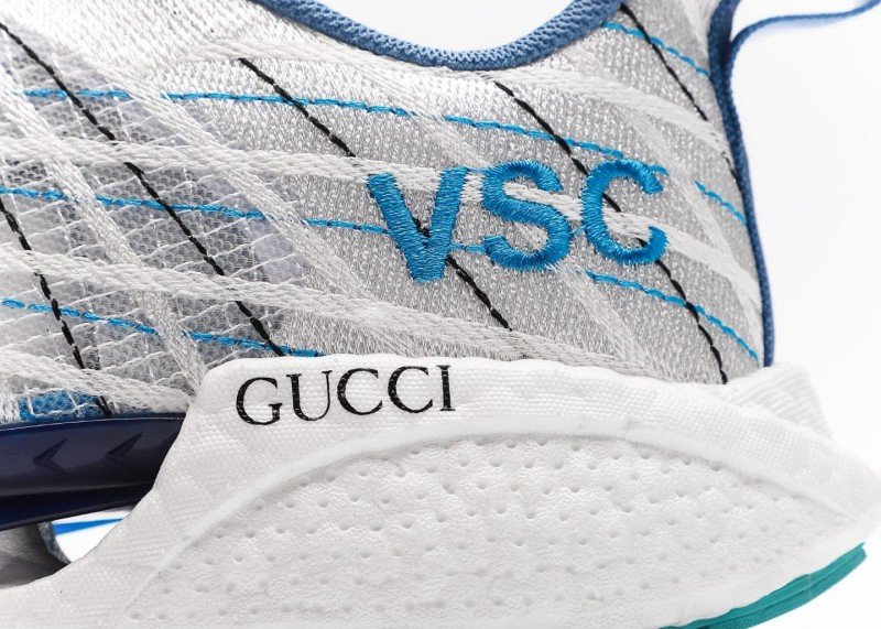 The combination of blue and black lines creates a classic retro college style. The eye-catching blue “VSC” lettering on the upper and the black “GUCCI” logo on the side complement each other, highlighting the brand’s recognition.