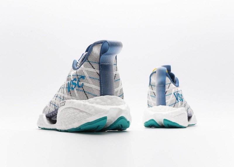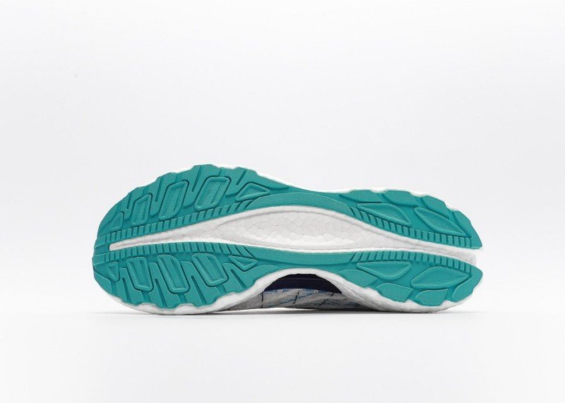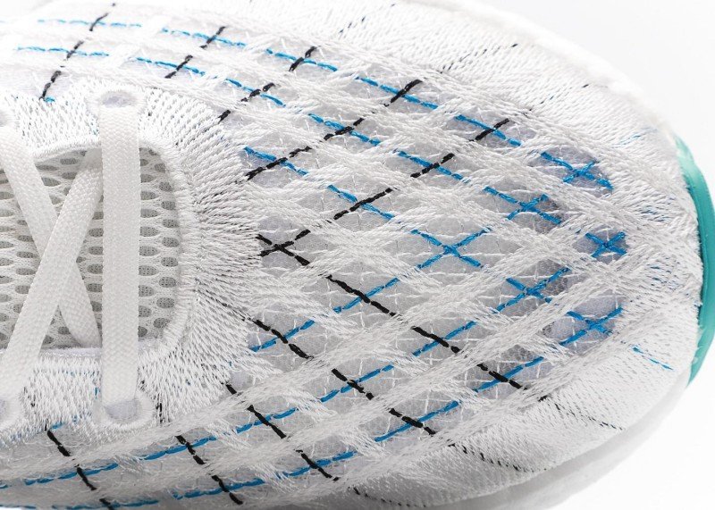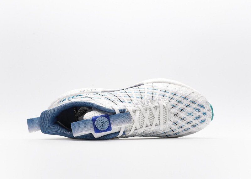 The sole features turquoise at the front and back edges, and a transparent midsole adds a technical touch. The mesh upper is lightweight and breathable, making it suitable for all-weather wear. The laces are tonal, and a blue pull tab at the collar makes it easy to put on and take off.