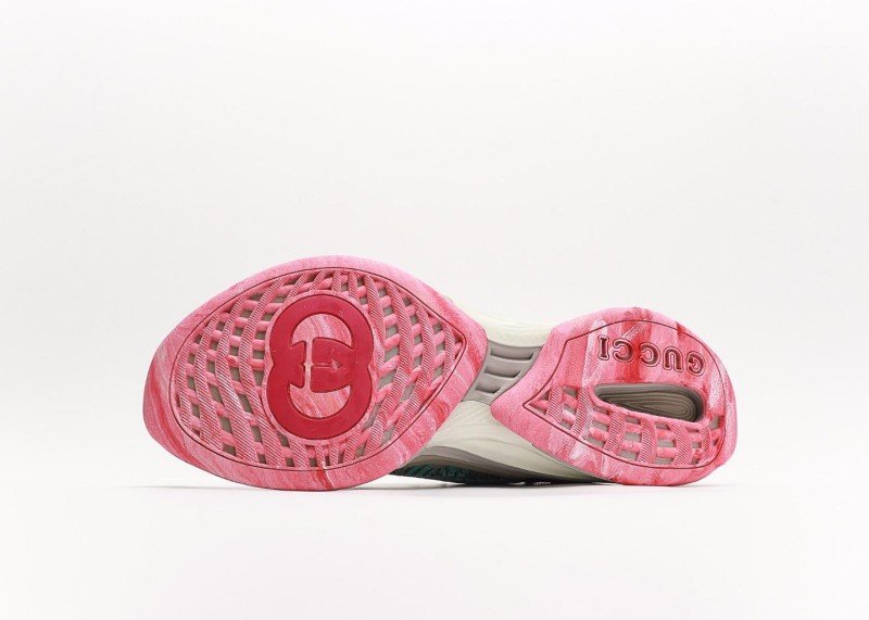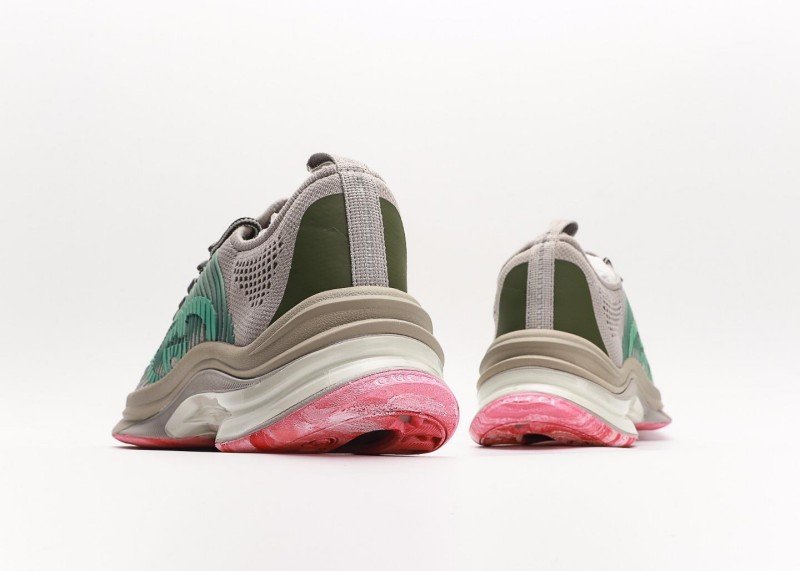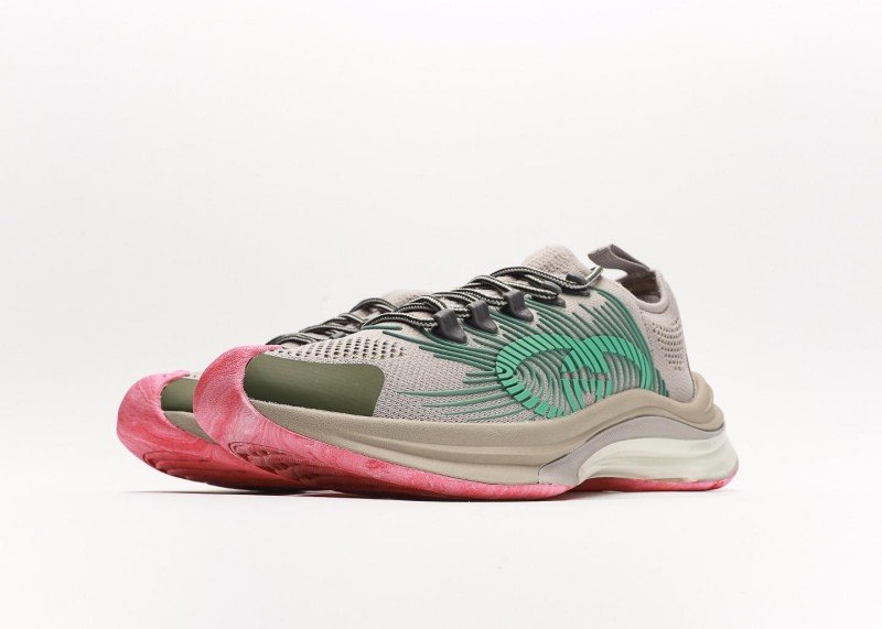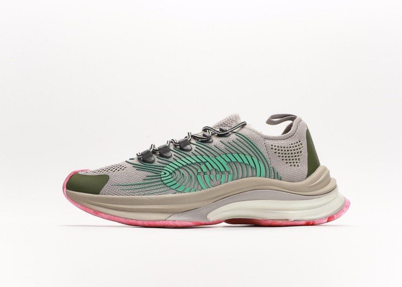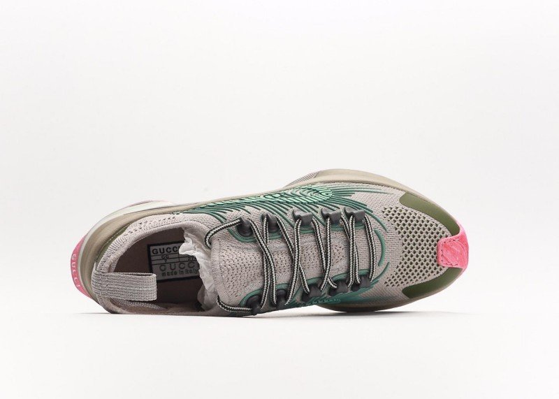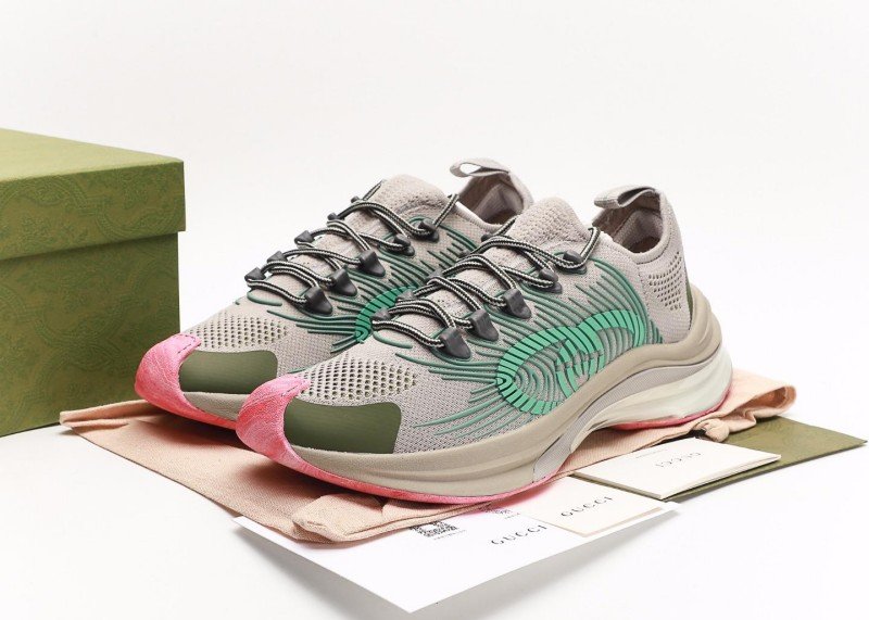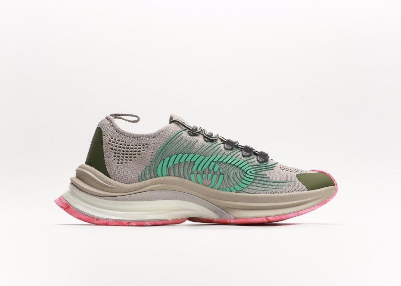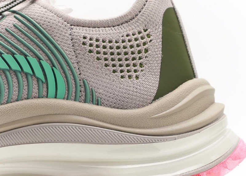 Gucci Embroidered Bee Sneakers feature grey mesh upper with green wave编织 pattern, orange bee embroidery. Italian calfskin toe cap and silk paneling redefine luxury sport style.