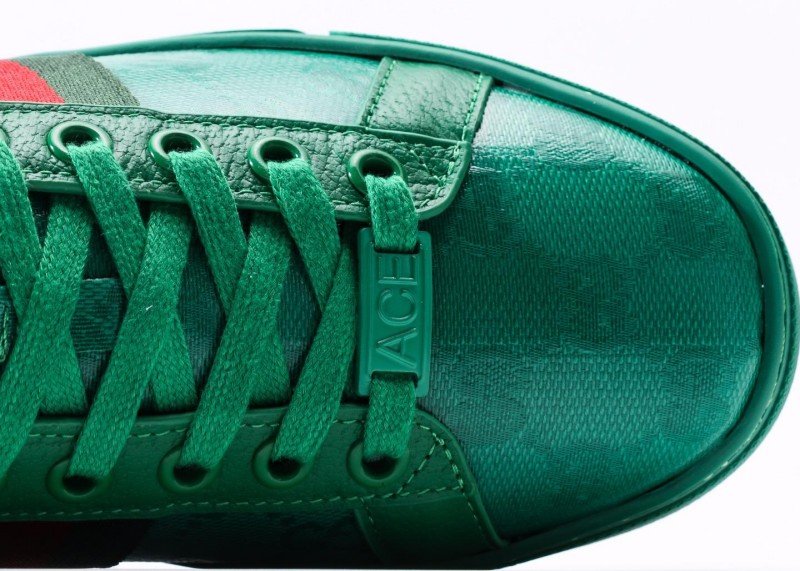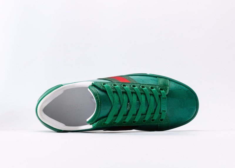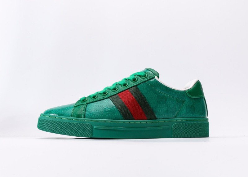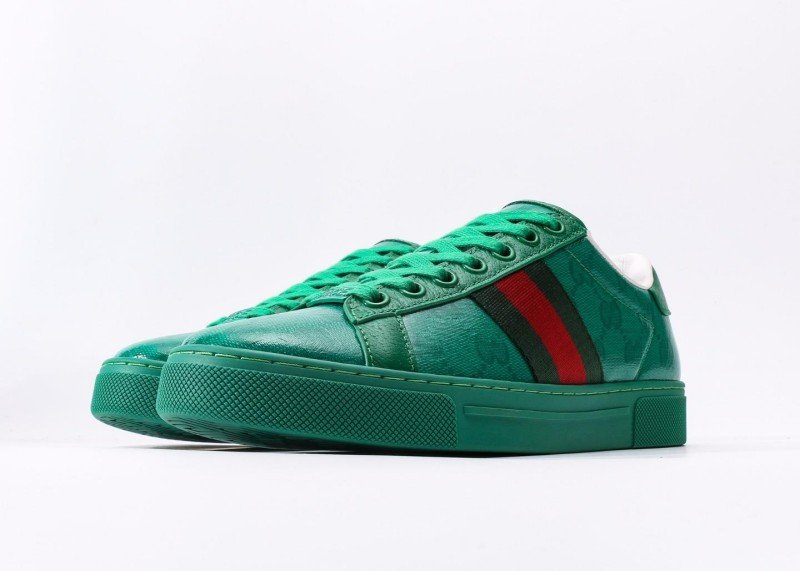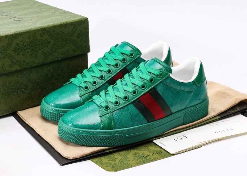 Gucci Green Sneaker Collection features market-exclusive high-end glueless technology, with dark green upper and classic double G embossed pattern, accented by green side stripes, available in sizes 35-46A.