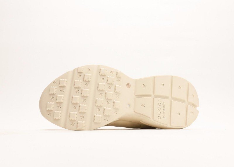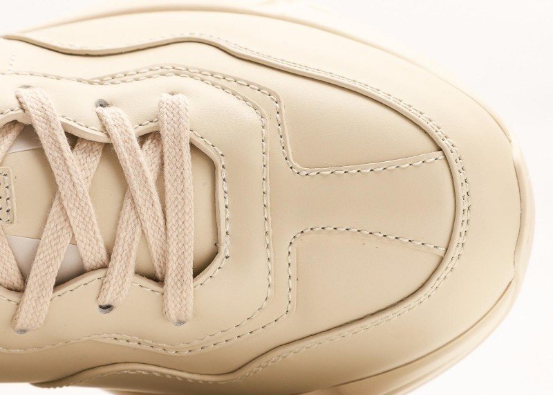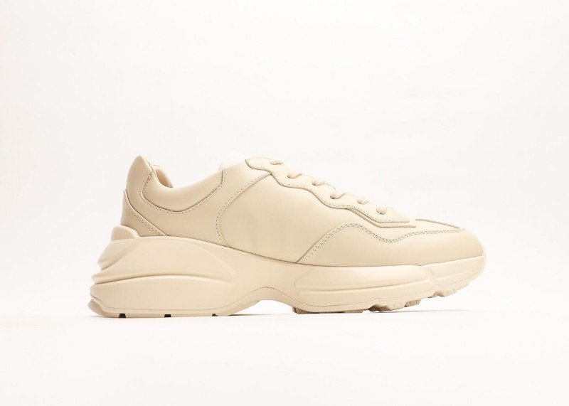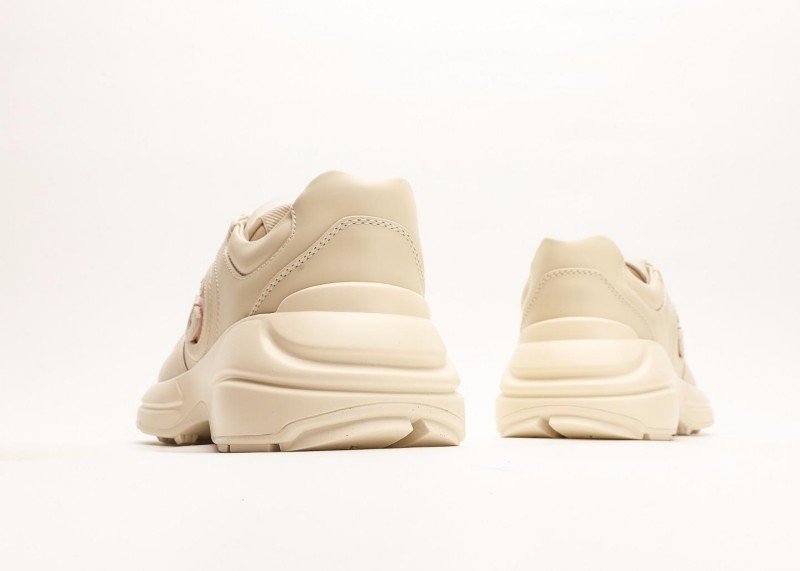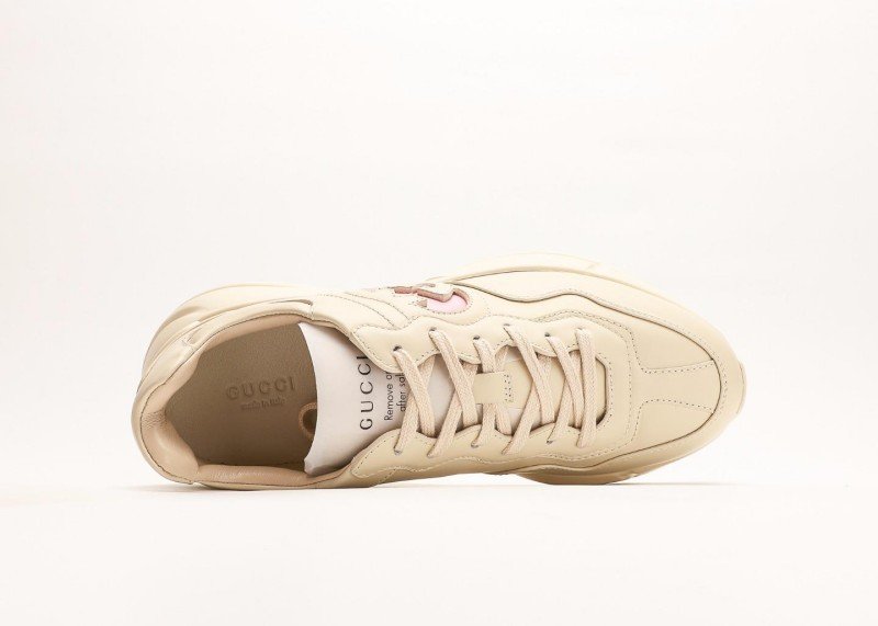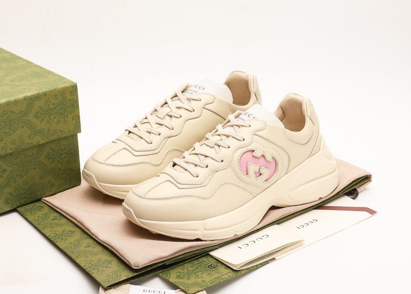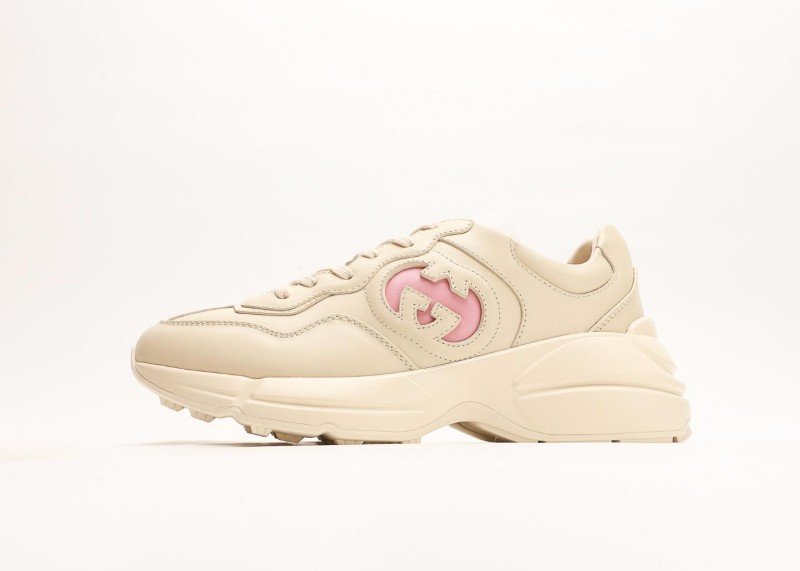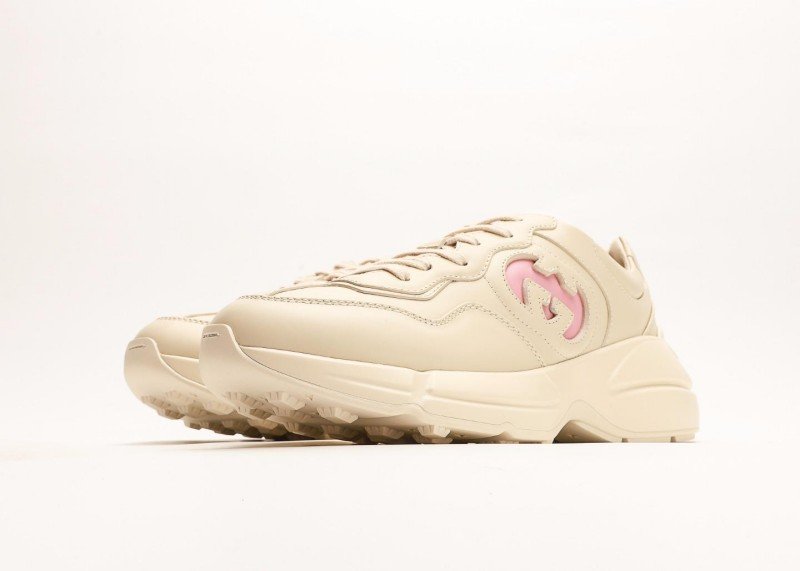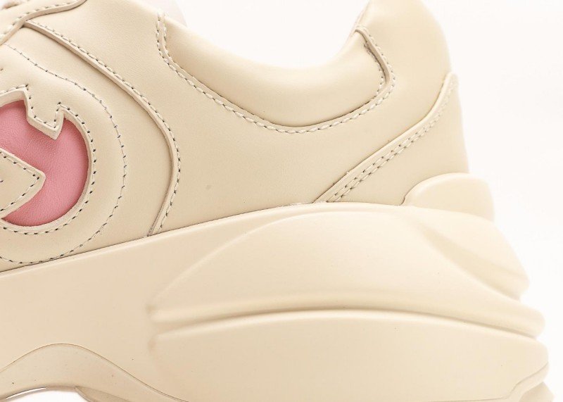 Gucci Rhyton features off-white calfskin upper with pink GG logo, embroidered craftsmanship. 5cm platform combines fashion and functionality, leading retro-minimalist trend.