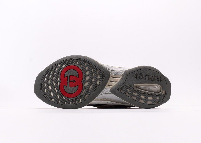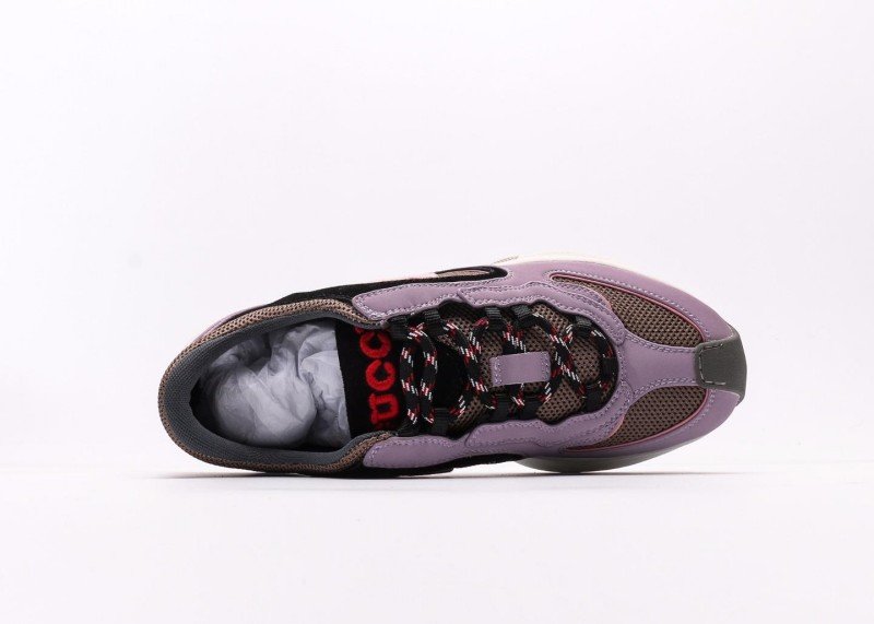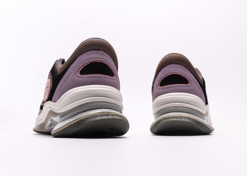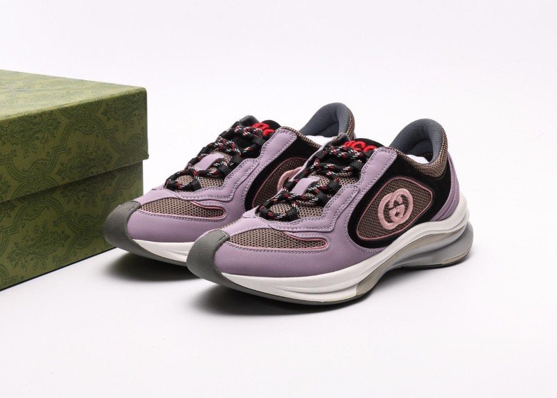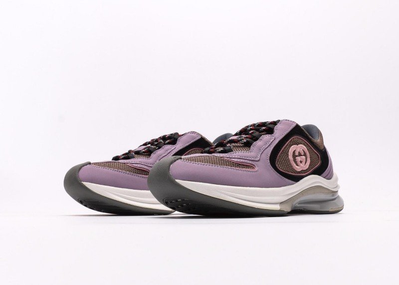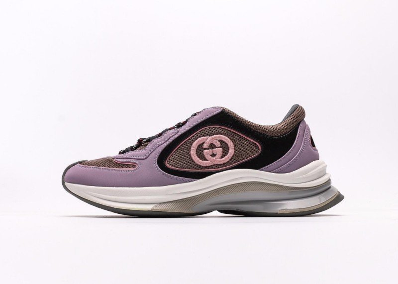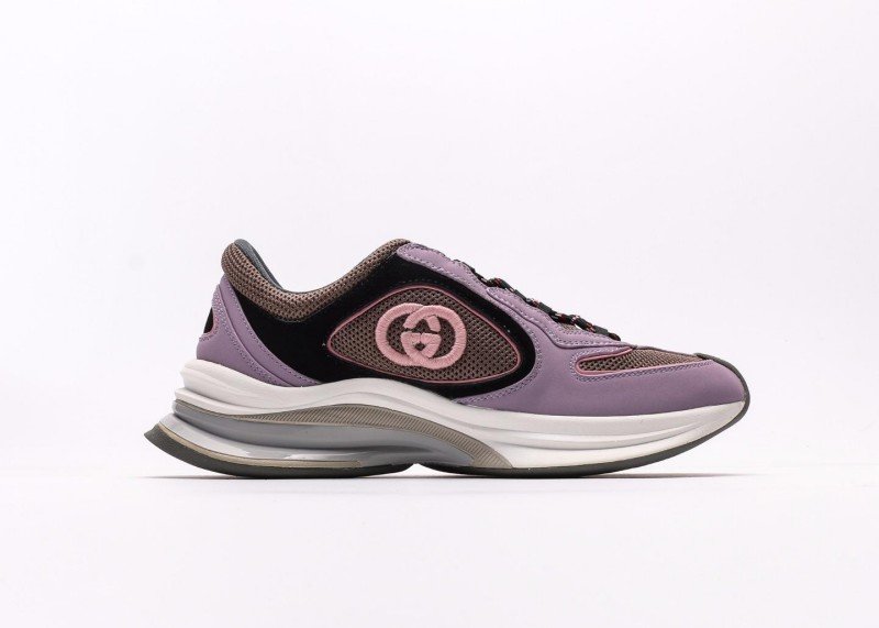 Gucci Rhyton features pink-purple panel upper with pink GG logo, mesh and full-grain leather combination. 5cm platform combines fashion and functionality, leading retro trend.