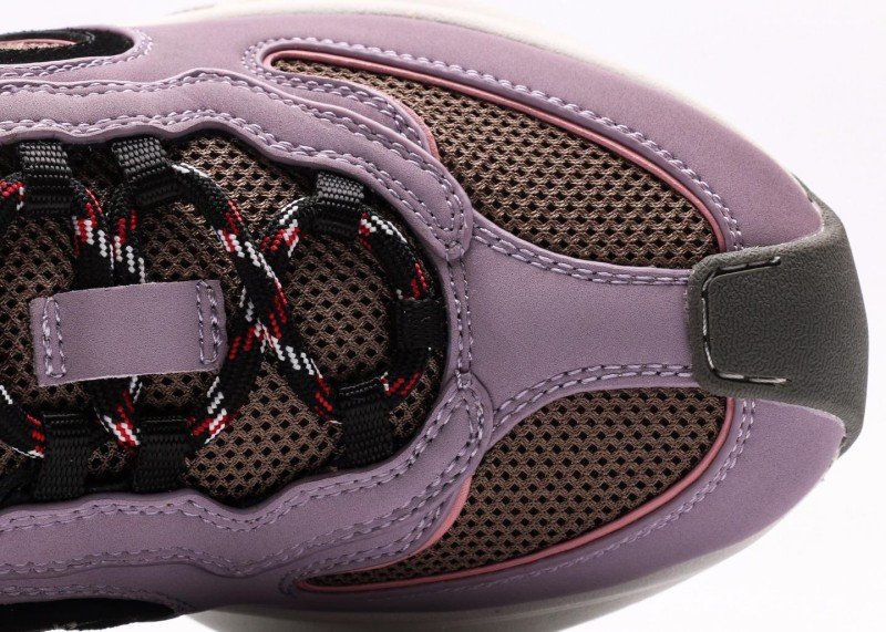 Genuine calfskin upper with lambskin lining, 480g single weight for comfort. TPU+foam sole ensures durability, color-fixed粉紫配色 resists fading, mesh design enhances breathability.
